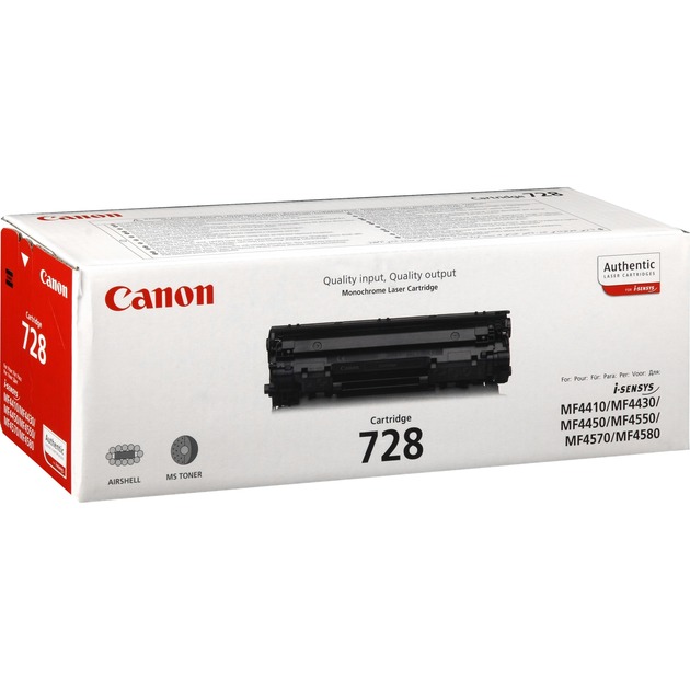 Der Toner CRG-728 (schwarz) von Canon ist für die Drucker i-Sensys MF4410, MF4430, MF4450, MF4570, MF4550 und MF4580 geeignet. Die Ergiebigkeit liegt bei ca. 2.100 DIN-A4-Seiten gemäß ISO/IEC 19752.
