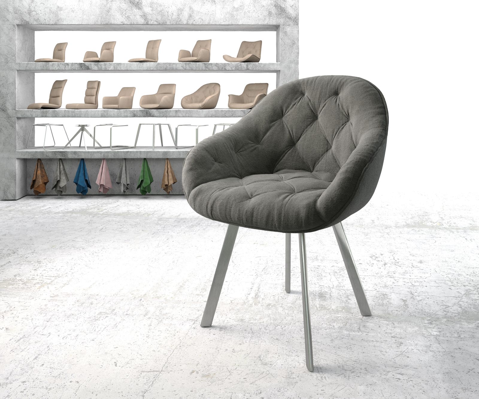 Die Sitzschale Gaio überzeugt durch die gewölbte Form und einer durchgehenden Armlehne mit hohem Sitzkomfort. Die dezenten und stilvollen Absteppungen an der Lehne machen den Stuhl zum Highlight im Esszimmer.Weiche Fasern, die an feine Wolle erinnern wurden in zeitlosem Anthrazit gehalten und sind dabei ganz weich zur Haut.Esszimmerstuhl Gaio Anthrazit Strukturstoff – die perfekte SitzgelegenheitEin besonderer Hingucker ist das 4-Fuß Gestell in ovaler Form. Trotz schlichtem Design sorgt das Gestell für die perfekte Abrundung und lässt sich mit jeder Sitzschale gut kombinieren.Das Stuhlgestell wurde aus hochwertigem, handgebürstetem Edelstahl hergestellt. Durch das Bürstenverfahren glänzt das Gestell in edler Optik und ist besonders widerstandsfähig gegen Rost und Verschleiß.