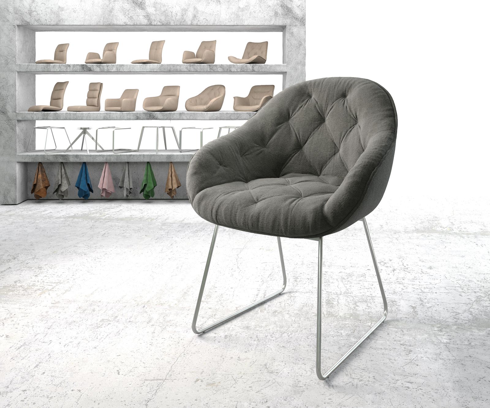 Die Sitzschale Gaio überzeugt durch die gewölbte Form und einer durchgehenden Armlehne mit hohem Sitzkomfort. Die dezenten und stilvollen Absteppungen an der Lehne machen den Stuhl zum Highlight im Esszimmer.Weiche Fasern, die an feine Wolle erinnern wurden in zeitlosem Anthrazit gehalten und sind dabei ganz weich zur Haut.Esszimmerstuhl Gaio Anthrazit Strukturstoff – die perfekte SitzgelegenheitDas Kufengestell verfügt über eine ausgefallene, gleichzeitig aber sehr dezente, offene Trapezform. Sie lässt sich besonders leicht mit vielen Einrichtungsstilen kombinieren.Das Stuhlgestell wurde aus hochwertigem, handgebürstetem Edelstahl hergestellt. Durch das Bürstenverfahren glänzt das Gestell in edler Optik und ist besonders widerstandsfähig gegen Rost und Verschleiß.