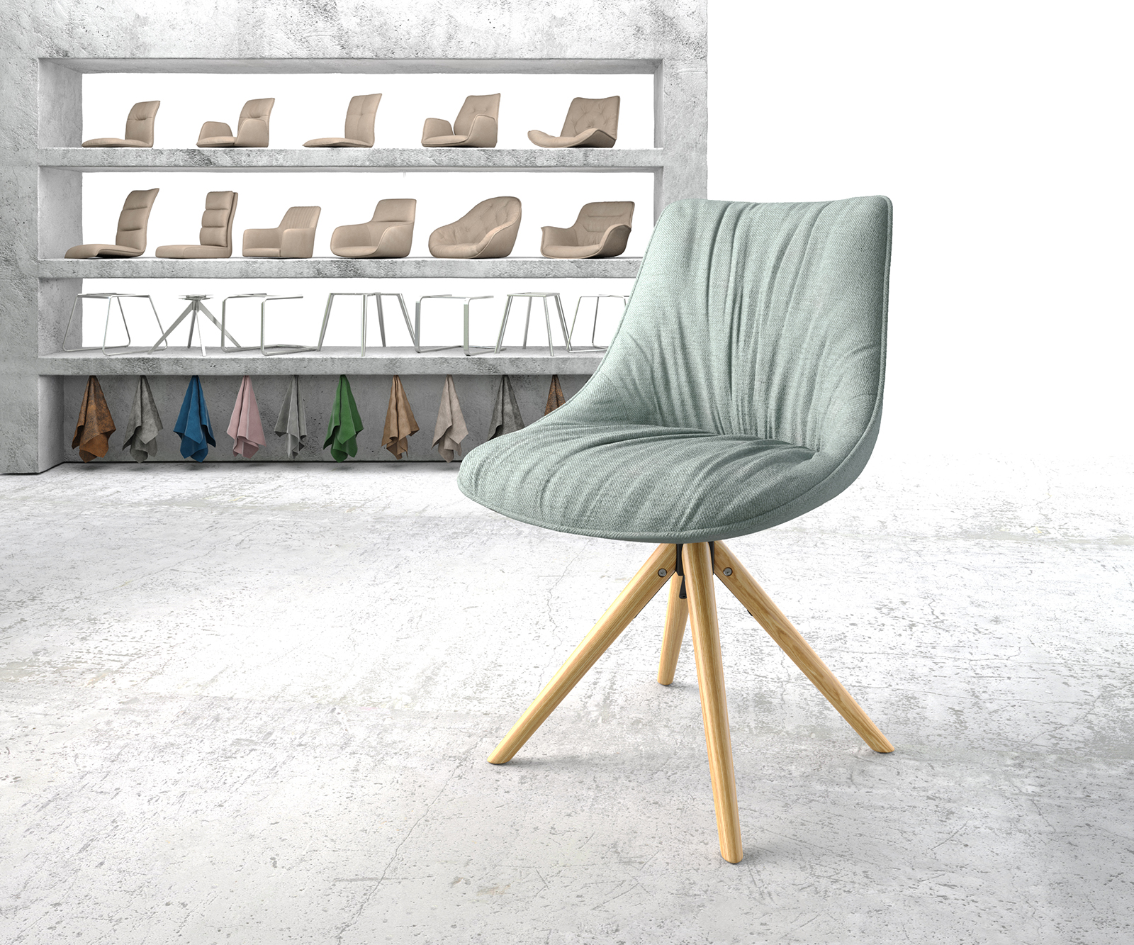 Elda ist der elegante Esszimmerstuhl für Ihren Essbereich. Die bequeme Sitzschale hat eine abgerundete Form, der Rücken geht fließend in den Sitzbereich über. Die besonders aufwendige Kedernaht verleiht Elda einen eleganten Charakter, der sich perfekt in verschiedenste Einrichtungsstile einfügt.Mit einer anschmiegsamen Haptik überzeugt der feingewebte Strukturstoff in einem modernen Mint-Ton, der sich toll in verschiedene Einrichtungsstile einfügen kann. Esszimmerstuhl Elda Mint Stripes – die perfekte SitzgelegenheitDas moderne Kreuzgestell mit konisch geschwungenen Füßen ist bis zu 180 Grad drehbar und verfügt über eine praktische Rückholfunktion. Sein moderner Look erinnert an den angesagten Scandy Stil und zaubert ein natürlich schönes Ambiente in deinen Essbereich.Das Gestell wurde aus hochwertiger und besonders robuster Eiche gefertigt. Die natürliche Farbgebung lässt sich ausgezeichnet mit verschiedenen Farben kombinieren und fügt sich hervorragend in Ihre Einrichtung.