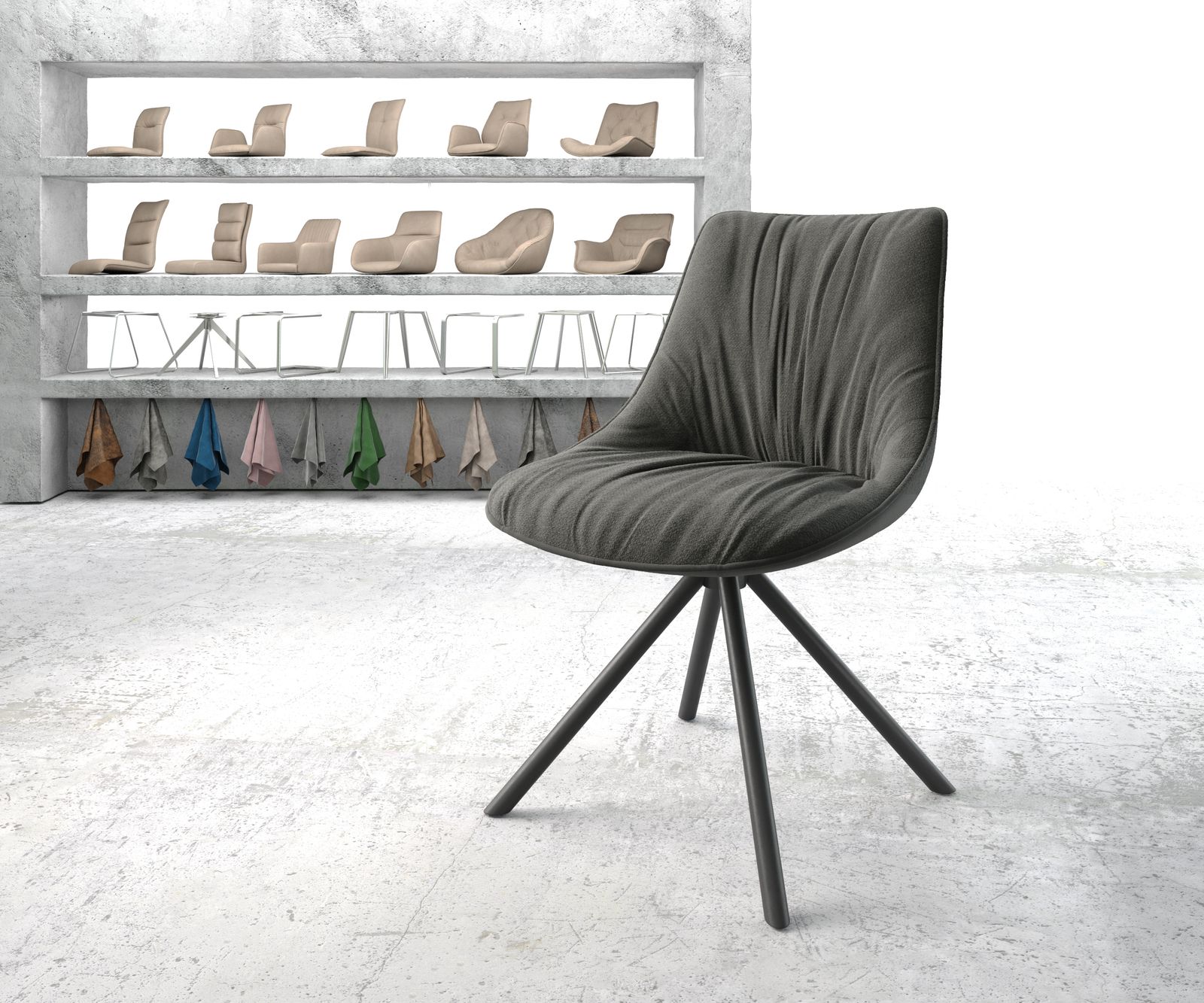 Elda ist der elegante Esszimmerstuhl für Ihren Essbereich. Die bequeme Sitzschale hat eine abgerundete Form, der Rücken geht fließend in den Sitzbereich über. Die besonders aufwendige Kedernaht verleiht Elda einen eleganten Charakter, der sich perfekt in verschiedenste Einrichtungsstile einfügt.Weiche Fasern, die an feine Wolle erinnern wurden in zeitlosem Anthrazit gehalten und sind dabei ganz weich zur Haut.Esszimmerstuhl Elda Anthrazit Strukturstoff – die perfekte SitzgelegenheitDie vier runden Füße dieses formschönen Kreuzgestell sorgen für besonderen sicheren Stand. Die zusätzliche Drehfunktion bis zu 180 Grad ist nicht nur herrlich praktisch sondern vor allem bei längeren Gesprächen am Tisch schonend für Hals- und Rückenwirbel.Durch das aufwendige Verfahren der Pulverbeschichtung entsteht eine sehr regelmäßige Oberfläche, die besonders robust und widerstandsfähig gegen Kratzer und Beschädigungen ist. Dadurch lässt sich das Gestell einfach reinigen und bleibt lange schön.