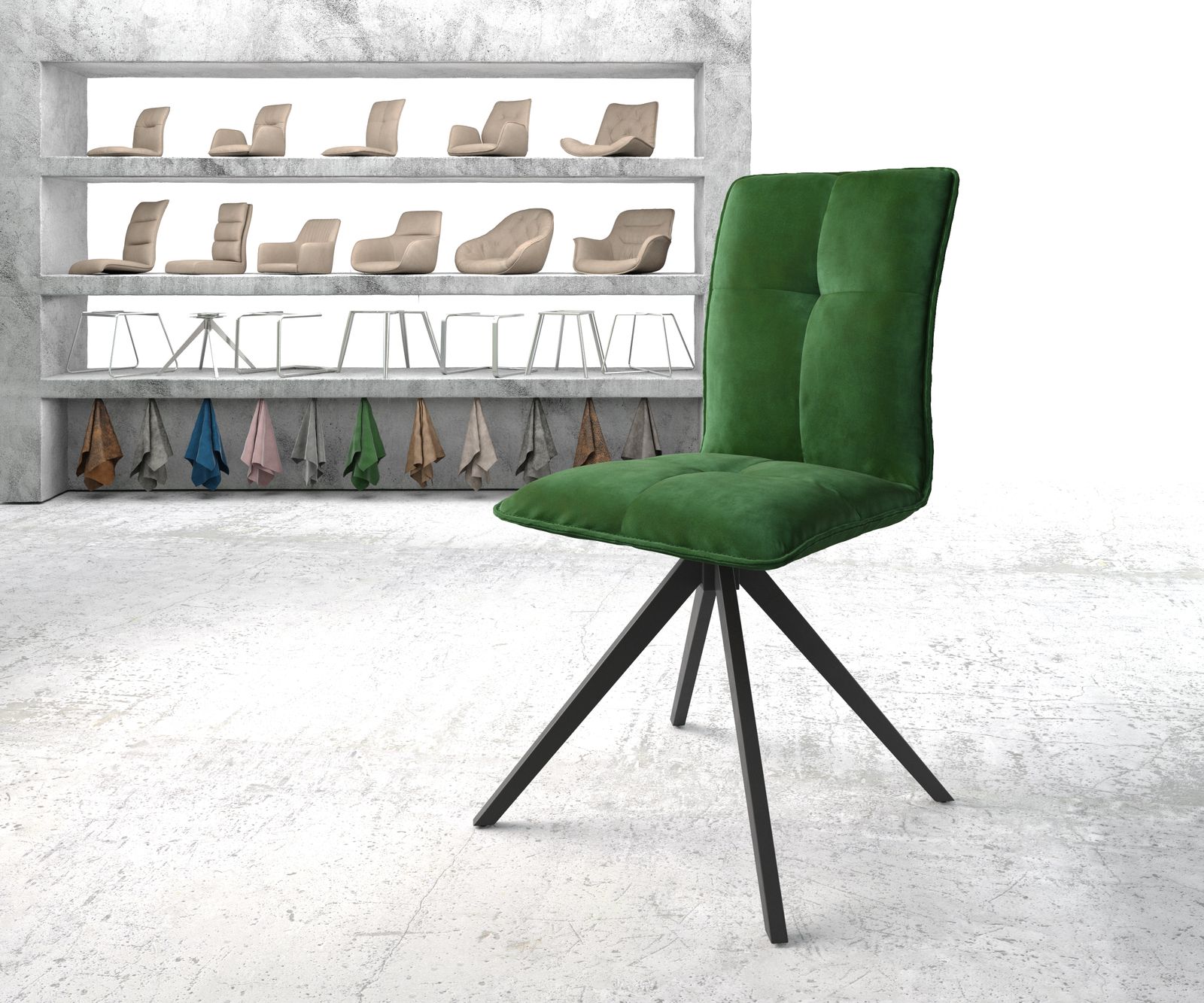 Maddy sticht durch die abgesteppte Kreuznaht auf Sitz – und Rückenfläche sowie die aufwendig verarbeitete Kedernaht elegant und auffällig aus der Masse heraus. Die sanft geschwungene Form ist herrlich bequem und rückenschonend.Der Samtstoff in einem zeitlos schönem Grünton überzeugt durch eine Oberfläche mit leichtem Glanz und einer samtweichen Haptik. Dank neuer Herstellungsverfahren und einer guten Verarbeitung ist der einst als so empfindlich geltende Samt heute ein durchaus widerstandfähiger Stoff, der sich auch für Stühle eignet. Esszimmerstuhl Maddy Grün Samt – die perfekte SitzgelegenheitDas Stuhlgestell mit Rückholfunktion verfügt über eine auffällige Kreuzform und lässt sich bequem bis zu 180 Grad drehen.Durch das aufwendige Verfahren der Pulverbeschichtung entsteht eine sehr regelmäßige Oberfläche, die besonders robust und widerstandsfähig gegen Kratzer und Beschädigungen ist. Dadurch lässt sich das Gestell einfach reinigen und bleibt lange schön.