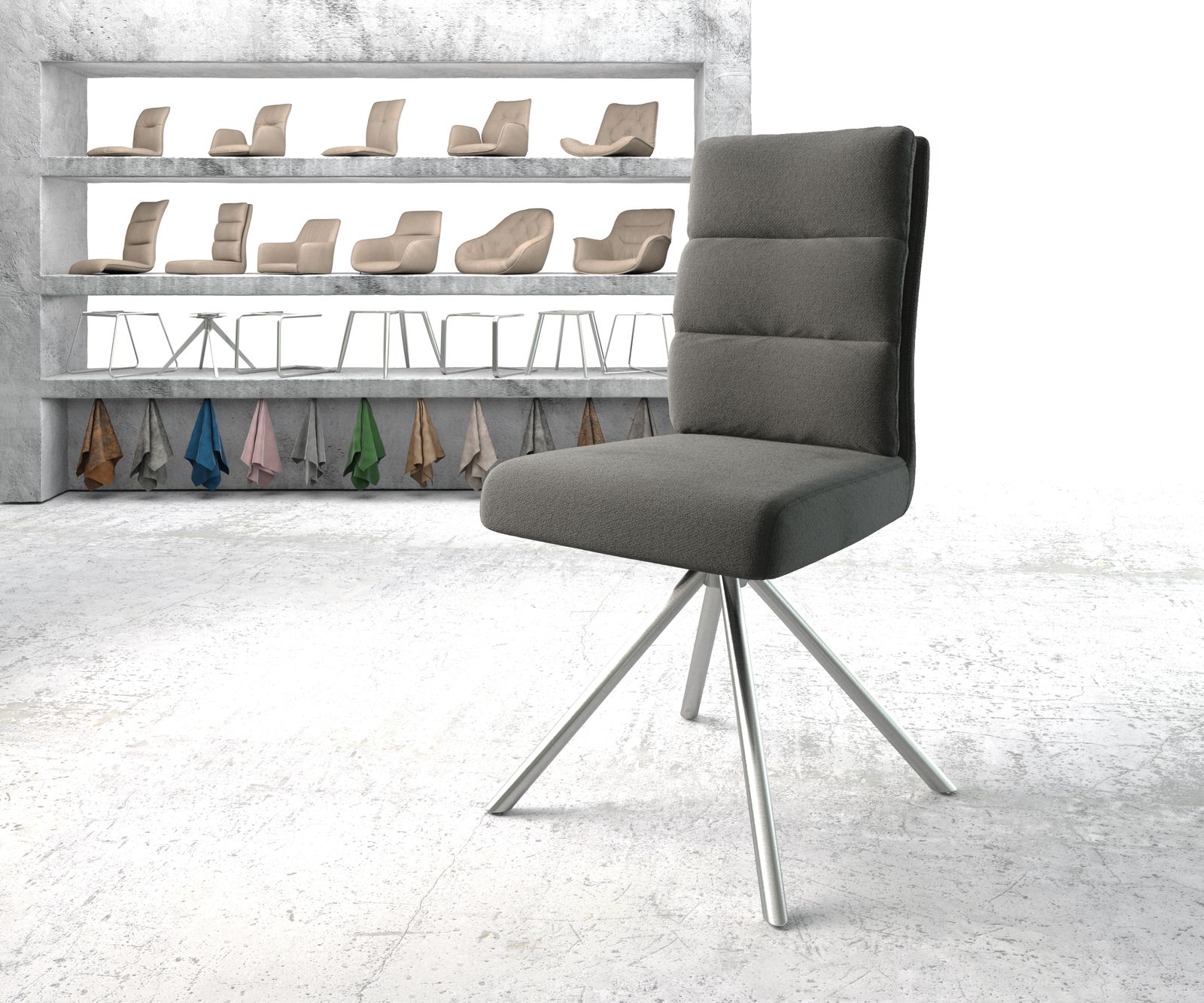 Pela sorgt für Komplimente. Denn mit ihrer hochwertigen Federkernpolsterung und der auffallenden Rückenkissen-Optik sieht diese Sitzschale nicht nur besonders elegant aus, sondern ist herrlich bequem und rückenschonend.Weiche Fasern, die an feine Wolle erinnern wurden in zeitlosem Anthrazit gehalten und sind dabei ganz weich zur Haut.Esszimmerstuhl Pela Anthrazit Strukturstoff – die perfekte SitzgelegenheitDie vier runden Füße dieses formschönen Kreuzgestell sorgen für besonderen sicheren Stand. Die zusätzliche Drehfunktion bis zu 180 Grad ist nicht nur herrlich praktisch sondern vor allem bei längeren Gesprächen am Tisch schonend für Hals- und Rückenwirbel.Das Stuhlgestell wurde aus hochwertigem, handgebürstetem Edelstahl hergestellt. Durch das Bürstenverfahren glänzt das Gestell in edler Optik und ist besonders widerstandsfähig gegen Rost und Verschleiß.
