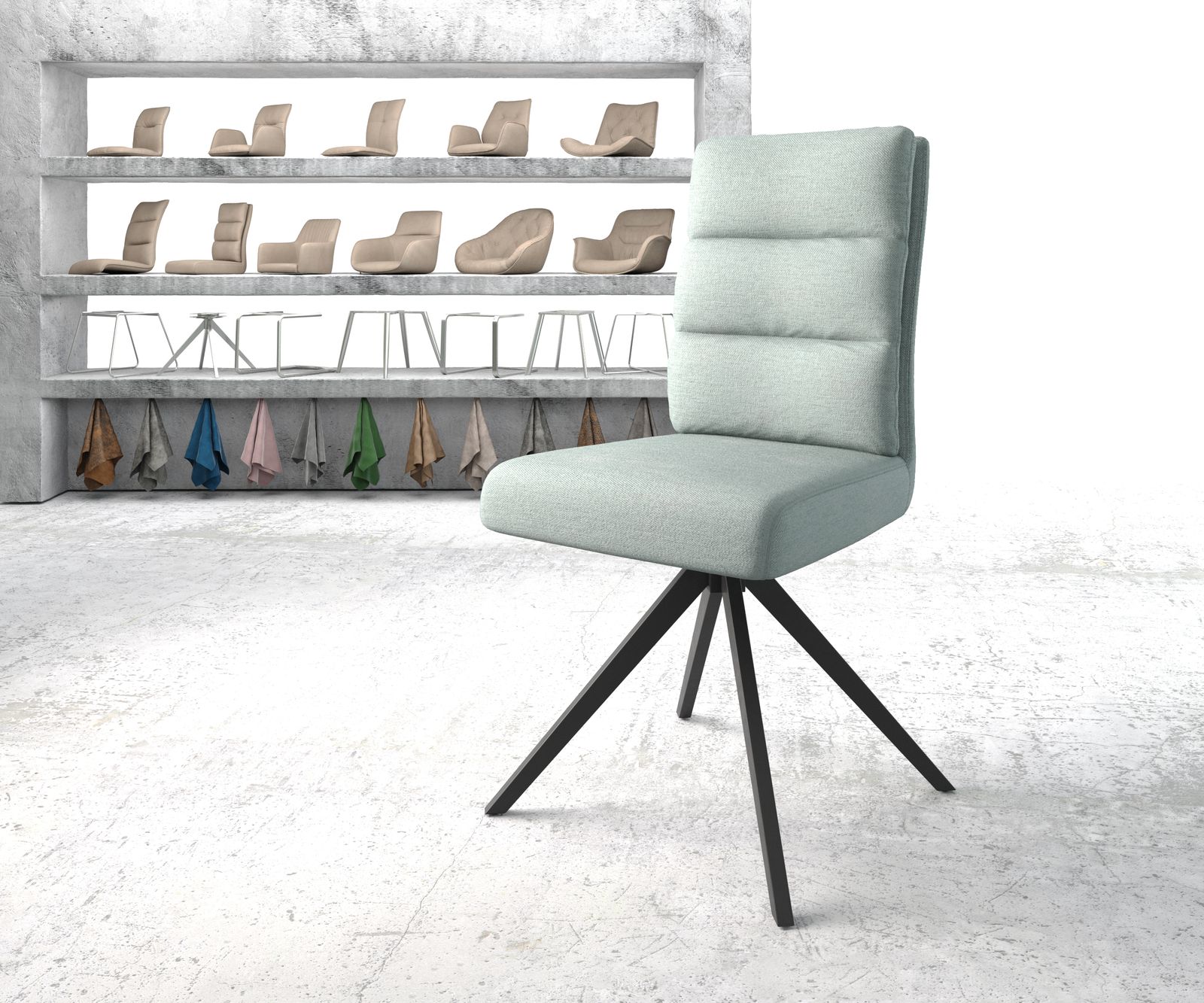 Pela sorgt für Komplimente. Denn mit ihrer hochwertigen Federkernpolsterung und der auffallenden Rückenkissen-Optik sieht diese Sitzschale nicht nur besonders elegant aus, sondern ist herrlich bequem und rückenschonend.Mit einer anschmiegsamen Haptik überzeugt der feingewebte Strukturstoff in einem modernen Mint-Ton, der sich toll in verschiedene Einrichtungsstile einfügen kann. Esszimmerstuhl Pela Mint Stripes – die perfekte SitzgelegenheitDas Stuhlgestell mit Rückholfunktion verfügt über eine auffällige Kreuzform und lässt sich bequem bis zu 180 Grad drehen.Durch das aufwendige Verfahren der Pulverbeschichtung entsteht eine sehr regelmäßige Oberfläche, die besonders robust und widerstandsfähig gegen Kratzer und Beschädigungen ist. Dadurch lässt sich das Gestell einfach reinigen und bleibt lange schön.