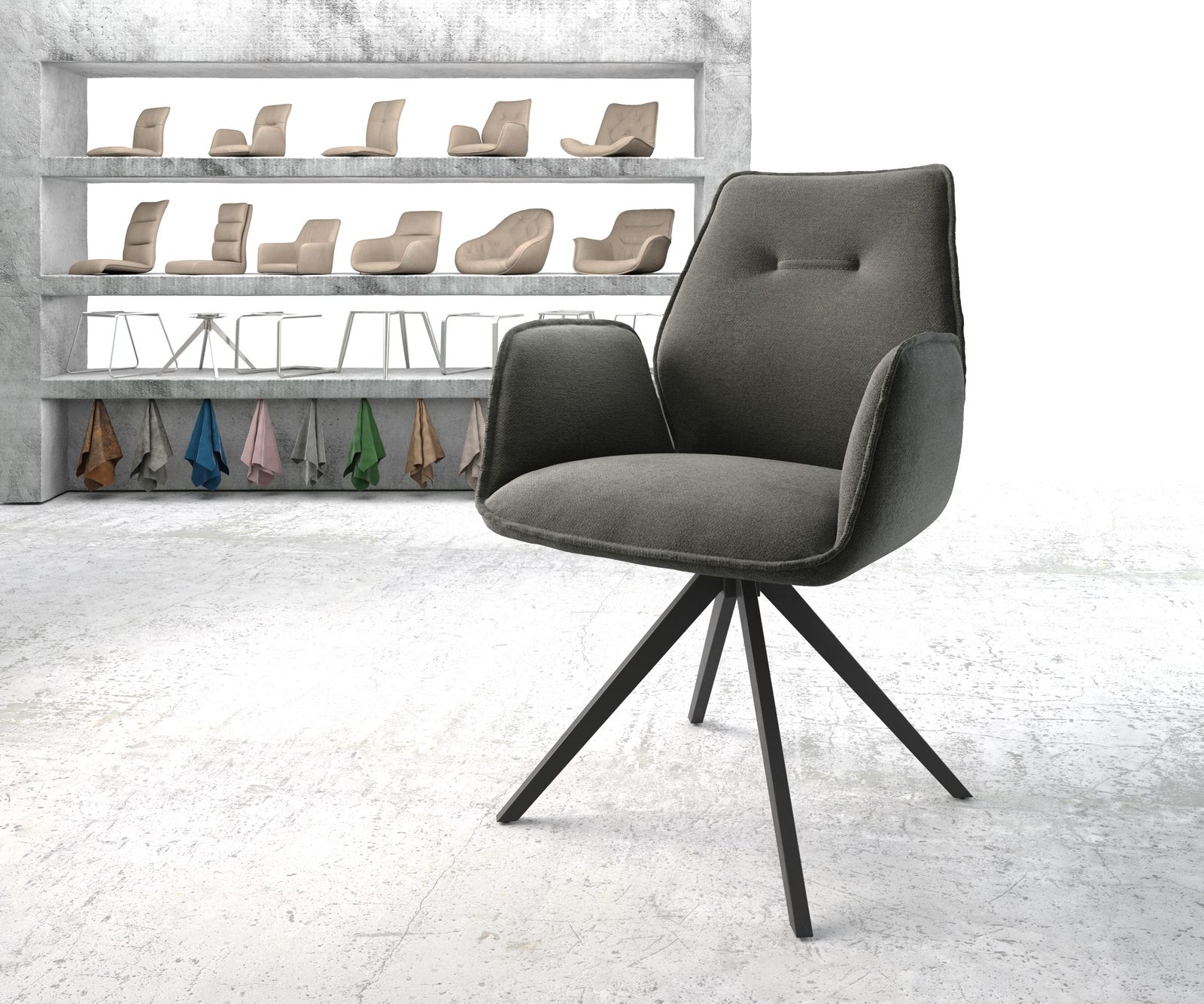 Die Sitzschale Zoa schmeichelt Ihrem Zuhause durch besonders schöne Details wie einer klassischen Kedernaht und einer feinen Absteppung mit Doppelziernaht an der Rückenlehne. Die weiche Polsterung und die ebenfalls gepolsterten, extravagant freistehenden Armlehnen sorgen für angenehmen Sitzkomfort.Weiche Fasern, die an feine Wolle erinnern wurden in zeitlosem Anthrazit gehalten und sind dabei ganz weich zur Haut.Esszimmerstuhl Zoa Anthrazit Strukturstoff – die perfekte SitzgelegenheitDas Stuhlgestell mit Rückholfunktion verfügt über eine auffällige Kreuzform und lässt sich bequem bis zu 180 Grad drehen.Durch das aufwendige Verfahren der Pulverbeschichtung entsteht eine sehr regelmäßige Oberfläche, die besonders robust und widerstandsfähig gegen Kratzer und Beschädigungen ist. Dadurch lässt sich das Gestell einfach reinigen und bleibt lange schön.