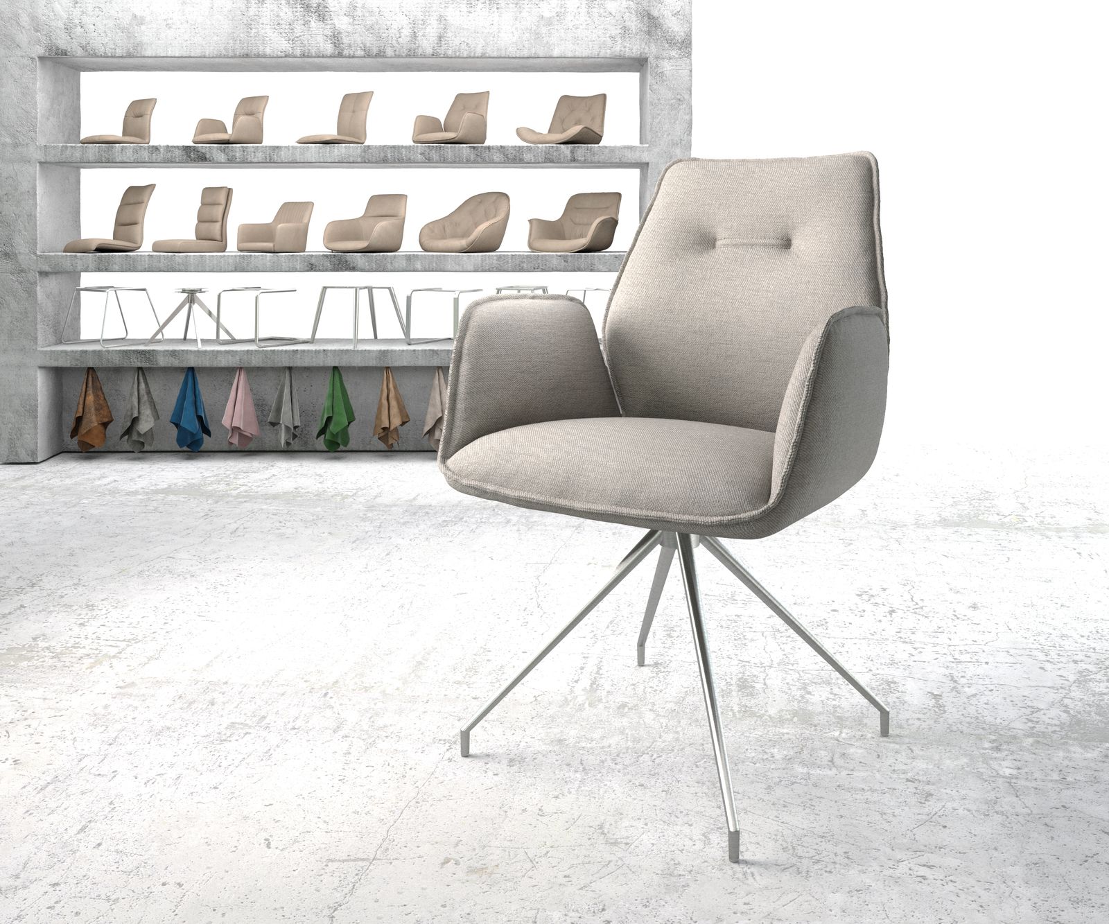 Die Sitzschale Zoa schmeichelt Ihrem Zuhause durch besonders schöne Details wie einer klassischen Kedernaht und einer feinen Absteppung mit Doppelziernaht an der Rückenlehne. Die weiche Polsterung und die ebenfalls gepolsterten, extravagant freistehenden Armlehnen sorgen für angenehmen Sitzkomfort.Der feingewebte Strukturstoff in zartem Hellgrau schafft eine freundlich helle Atmosphäre und lässt sich in viele Wohnstile problemlos integrieren.Esszimmerstuhl Zoa Hellgrau Stripes – die perfekte SitzgelegenheitDas Kreuzgestell überzeugt durch sein einmaliges Design. Vier Füße verlaufen in sanft konischer Form und knicken dramatisch zum Boden hin ab. Das sieht nicht nur aufregend gut aus, sondern sorgt für besonders sicheren Stand. Das Kreuzgestell verfügt über eine zusätzliche Drehfunktion inkl. Rückholfunktion von 180 Grad und macht diesen Stuhl deshalb herrlich praktisch und komfortabel.Das Stuhlgestell wurde aus hochwertigem, handgebürstetem Edelstahl hergestellt. Durch das Bürstenverfahren glänzt das Gestell in edler Optik und ist besonders widerstandsfähig gegen Rost und Verschleiß.