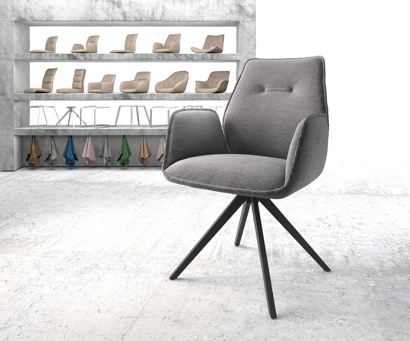 Die Sitzschale Zoa schmeichelt Ihrem Zuhause durch besonders schöne Details wie einer klassischen Kedernaht und einer feinen Absteppung mit Doppelziernaht an der Rückenlehne. Die weiche Polsterung und die ebenfalls gepolsterten, extravagant freistehenden Armlehnen sorgen für angenehmen Sitzkomfort.Der hellgraue Strukturstoff erinnert durch seine weichen Fasern an die Haptik edler Wolle und überzeugt mit einer hochwertigen Qualität.Esszimmerstuhl Zoa Hellgrau Strukturstoff – die perfekte SitzgelegenheitDas Stuhlgestell mit Rückholfunktion verfügt über eine auffällige Kreuzform und lässt sich bequem bis zu 180 Grad drehen.Durch das aufwendige Verfahren der Pulverbeschichtung entsteht eine sehr regelmäßige Oberfläche, die besonders robust und widerstandsfähig gegen Kratzer und Beschädigungen ist. Dadurch lässt sich das Gestell einfach reinigen und bleibt lange schön.