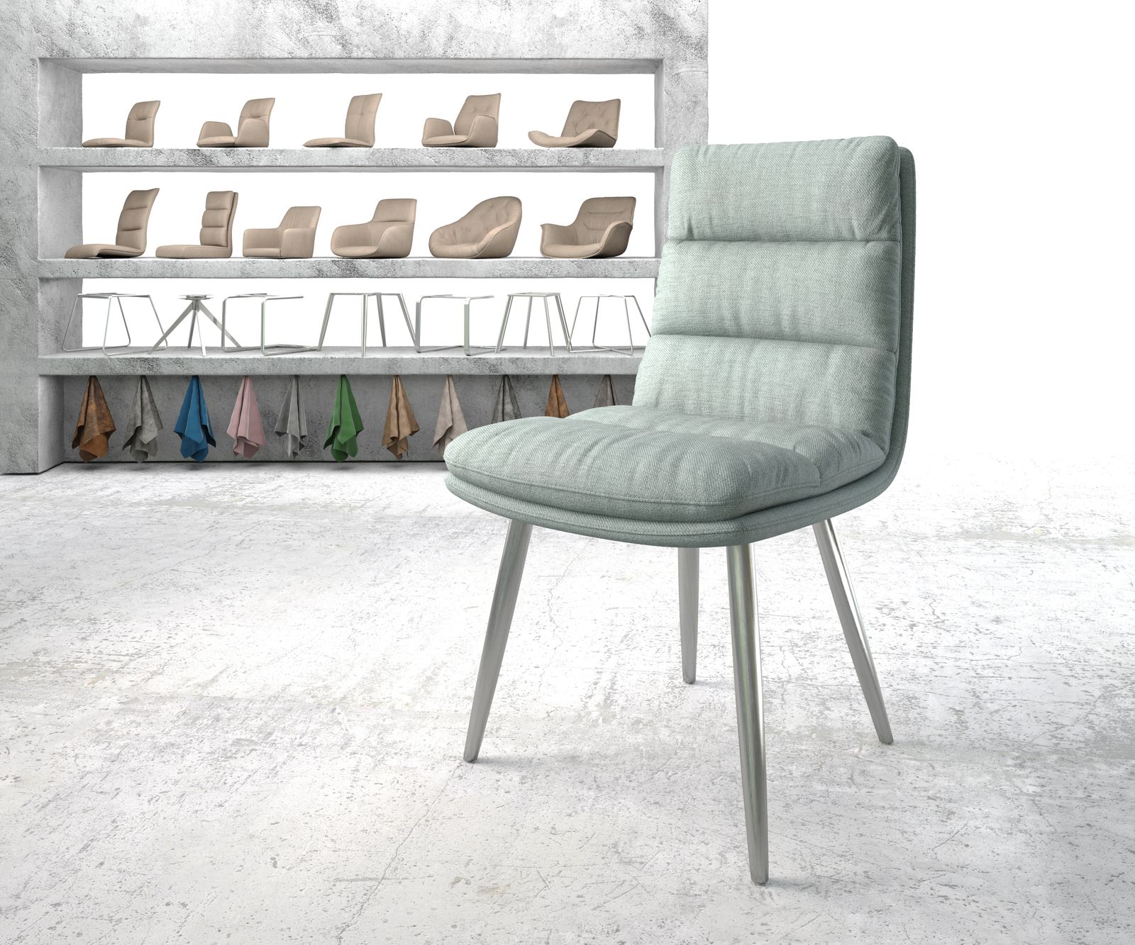 Abelia beeindruckt durch sein zeitlos schönes Design mit Loser-Kissen-Optik und luxuriösem Sitzkomfort. Die breite Sitzfläche macht das Sitzen zum gemütlichen Vergnügen über viele Stunden.Mit einer anschmiegsamen Haptik überzeugt der feingewebte Strukturstoff in einem modernen Mint-Ton, der sich toll in verschiedene Einrichtungsstile einfügen kann. Esszimmerstuhl Abelia Mint Stripes – die perfekte SitzgelegenheitDer elegante 4-Fuß ist besonders standfest und durch sein einfach gehaltenes Design ein zeitloser Klassiker der mit vielen Wohnstilen kombiniert werden kann. Das Stuhlgestell wurde aus hochwertigem, handgebürstetem Edelstahl hergestellt. Durch das Bürstenverfahren glänzt das Gestell in edler Optik und ist besonders widerstandsfähig gegen Rost und Verschleiß.