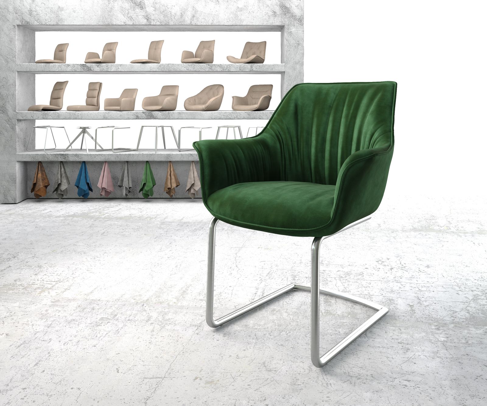 Esszimmerstuhl Keila-Flex mit Armlehnen Samt Grün Freischwinger rund Edelstahl