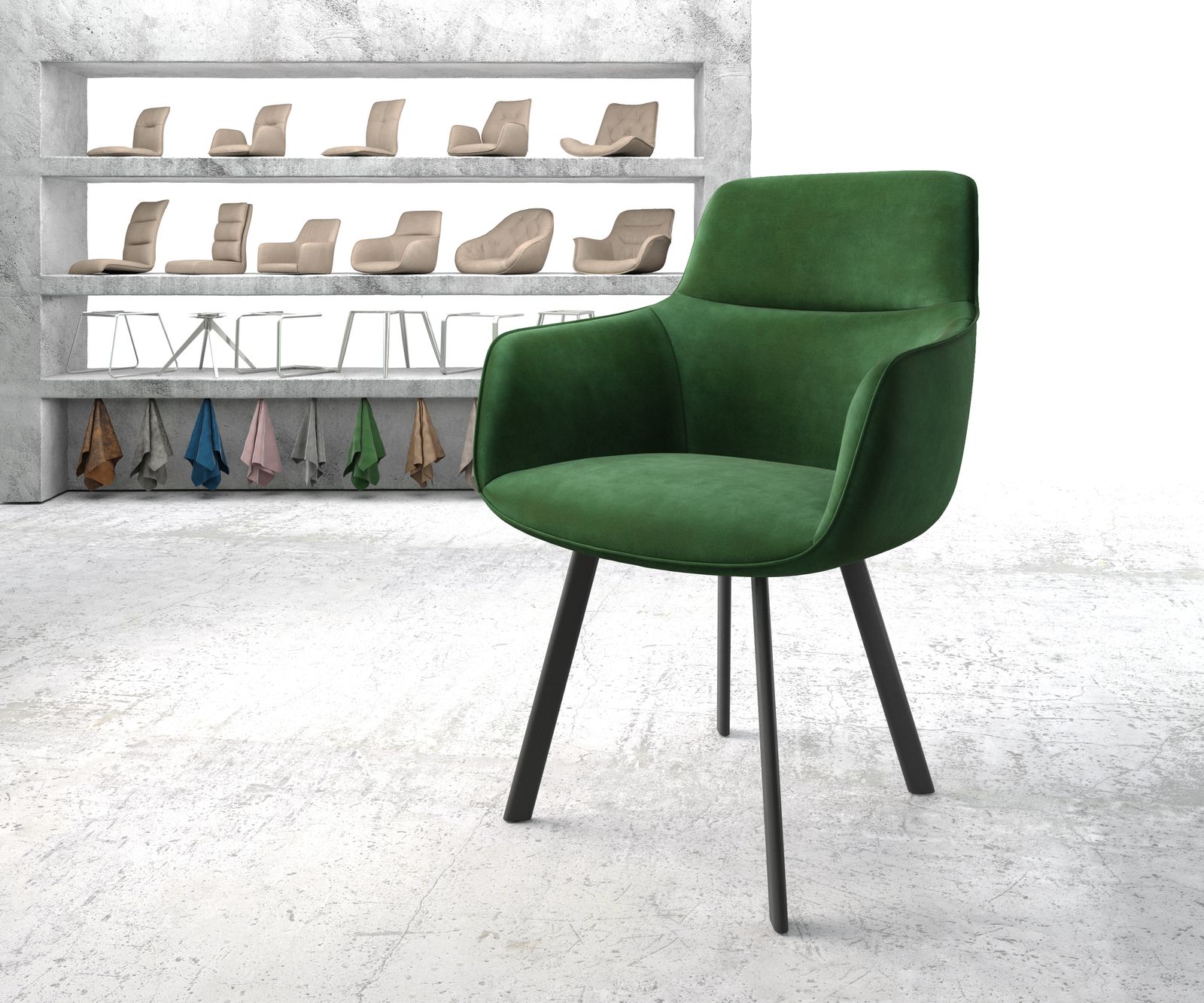 Die Sitzschale Pejo ist durch ihr klassisches Design mit durchgehenden Armlehnen ganz besonders bequem. Die hochwertige Ziernaht an der Rückenlehne macht sie zu einem edlen Hingucker.Der Samtstoff in einem zeitlos schönem Grünton überzeugt durch eine Oberfläche mit leichtem Glanz und einer samtweichen Haptik. Dank neuer Herstellungsverfahren und einer guten Verarbeitung ist der einst als so empfindlich geltende Samt heute ein durchaus widerstandfähiger Stoff, der sich auch für Stühle eignet. Esszimmerstuhl Pejo Grün Samt – die perfekte SitzgelegenheitEin besonderer Hingucker ist das 4-Fuß Gestell in ovaler Form. Trotz schlichtem Design sorgt das Gestell für die perfekte Abrundung und lässt sich mit jeder Sitzschale gut kombinieren.Durch das aufwendige Verfahren der Pulverbeschichtung entsteht eine sehr regelmäßige Oberfläche, die besonders robust und widerstandsfähig gegen Kratzer und Beschädigungen ist. Dadurch lässt sich das Gestell einfach reinigen und bleibt lange schön.