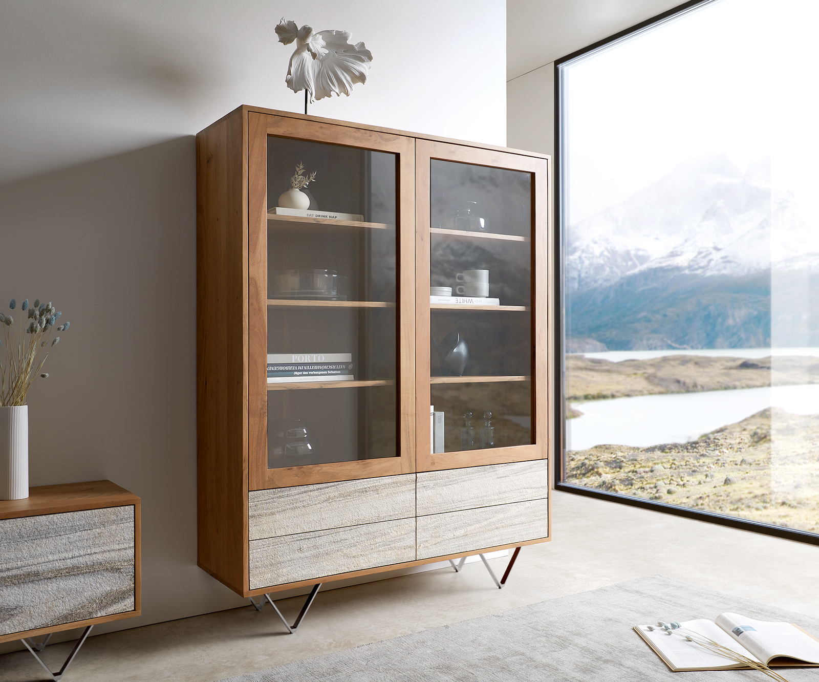 Vitrine Kleo 115×150 cm Akazie Natur 2 Türen 4 Schübe V-Fuß Edelstahl