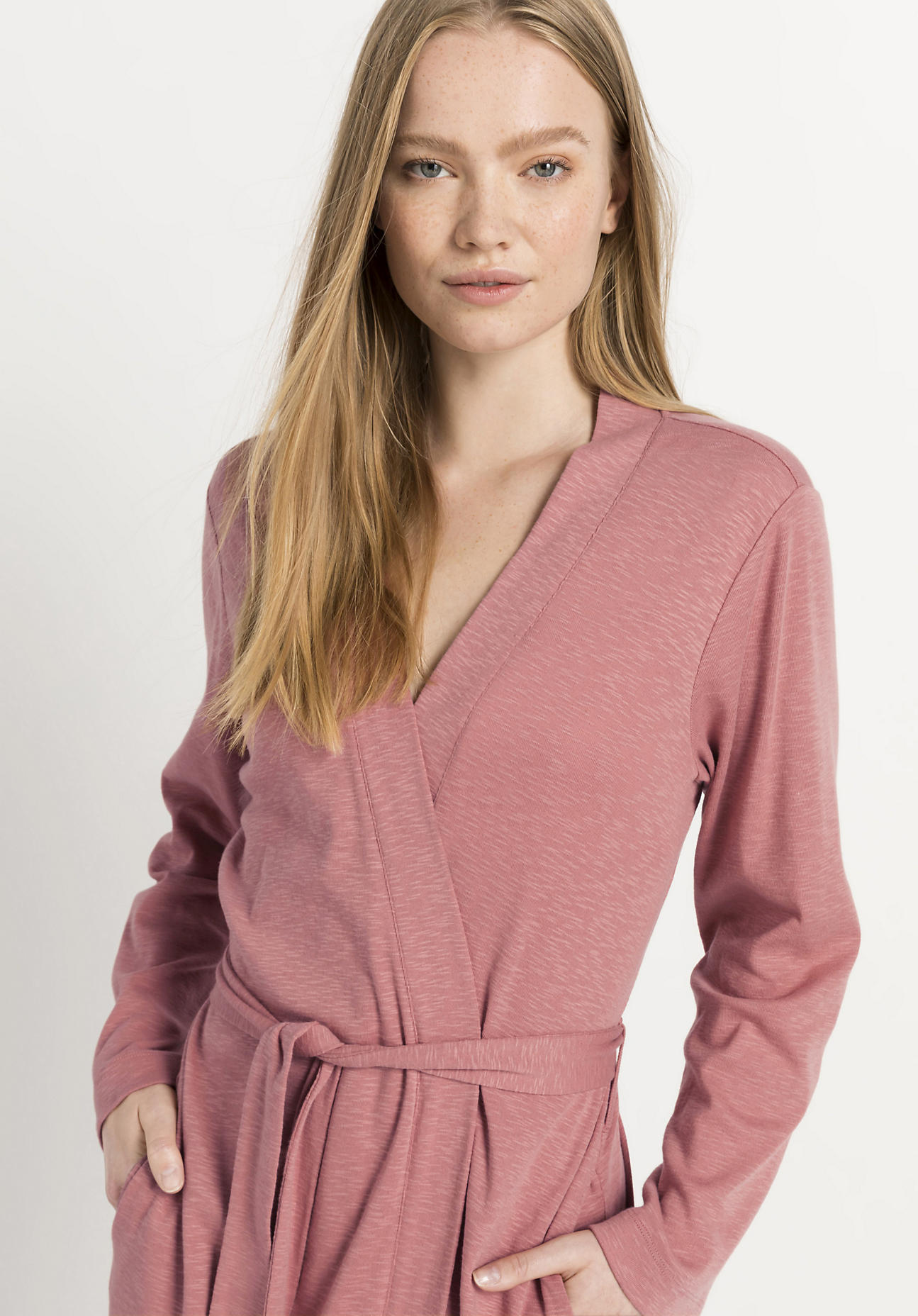 Guten Morgen! Schnell hineingeschlüpft in den Morgenmantel aus softer Bio-Baumwolle in zartem Flamméjersey. Er passt schön über den entspannten Wohlfühl-Look kurz nach dem Aufstehen. Der leichte Jersey-Mantel hat eine weite, bequeme Passform, Seitentaschen und einen Taillenbindegürtel. Mit einem Schwung begleitet er Sie in den Tag. Wussten Sie, dass Bio-Baumwolle eine einjährige Pflanze ist? In der idealen Fruchtfolge baut man sie nur alle fünf Jahre auf dem gleichen Feld wieder an. Dazwischen können Erdnüsse, Getreide und Fingerhirse wachsen. Ein Jahr lässt man die Erde ruhen, damit sich der Boden vollständig regeneriert und die Artenvielfalt erhalten bleibt. Wir schätzen diesen Boden erhaltenden Kreislauf und unterstützen bei der Umstellung auf Bio-Anbau. Weil am Ende Sie spüren können, wie gut die Bio-Baumwolle Ihrer Haut und der Umwelt tut.