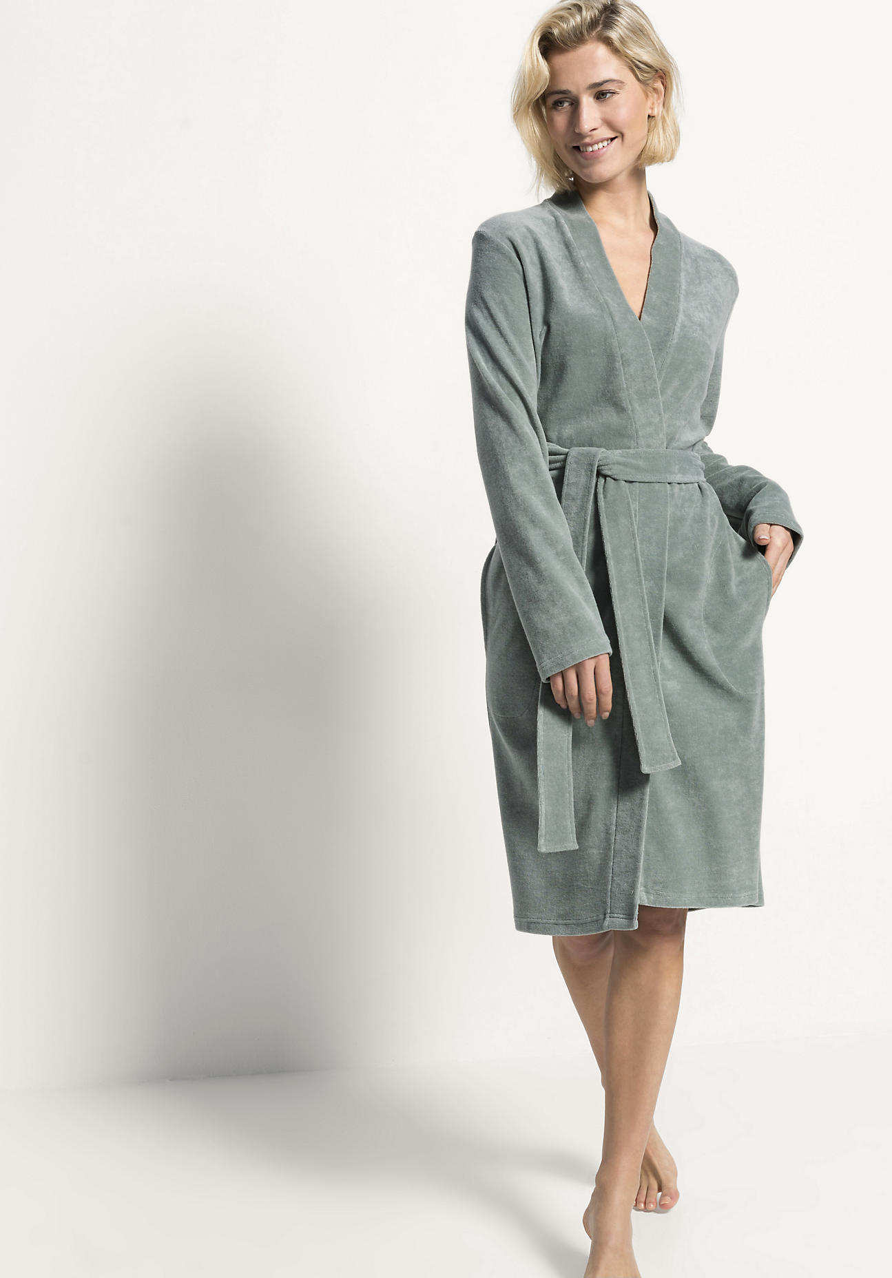 Details: hessnatur Wellness-Bademantel aus Bio-Frottee-Jersey – grün – Größe L