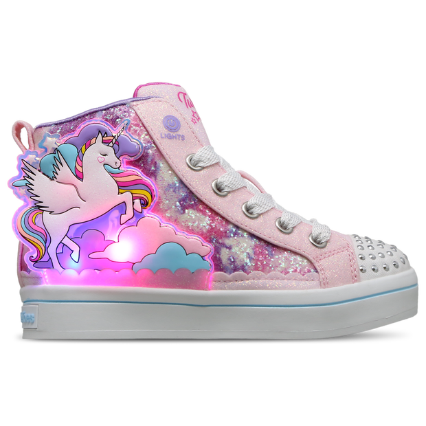 Es ist magisch Die Skechers Twinkle Toes verzaubern die Schritte deiner Kleinen mit ihrer Magie: Twi-Lites 2.0 – Enchanted Unicorn. Diese leuchtenden High-Top-Sneaker mit ihrem glitzernden Obermaterial aus Synthetik verleihen dem Spieltag deiner Kinder den letzten Schliff. Der Schnürverschluss sorgt zusammen mit dem seitlichen Reißverschluss für eine verstellbare Passform unterwegs. Die stoßdämpfende Zwischensohle sorgt für unschlagbaren Komfort bei den Schritten deiner zukünftigen Ikonen, wenn sie sich stylisch auf den Weg machen. Produktdetails für Skechers Twinkle Toes: Produktdetails für Twi-Lites 2.0 – Enchanted Unicorn: * Knöchelhohes Design * Obermaterial: Synthetisches Gewebe mit Glitzer-Finish * Twinkle Toes-Zehenkappe mit Strass * Schnürung und Seitenreißverschluss * Twinkle-Toes-Logo * Grafik mit fliegendem Einhorn und Wolken an der Seite * Gepolsterte Komfort-Einlegesohle * Flexible Traktionslaufsohle * Größere Kindergrößen verfügen über Ein-/Aus-Taste