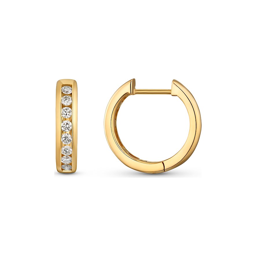 Etwas breiter, aber nicht aufdringlich: Die wertvollen Creolen haben eine festliche und zugleich seriöse Aura. Als Basis verwendet CHRIST schimmerndes, poliertes 585er Gold. Die Ohrringe haben vorne eine Vertiefung, in der Diamanten sitzen. Von diesen geht ein wunderschönes Strahlen aus, das zahlreiche Blicke auf sich zieht. Die Klapp-Creolen lassen sich nicht nur solo tragen, sondern sie eignen sich auch als Ergänzung zu weiterem Gold- und Brillantschmuck.