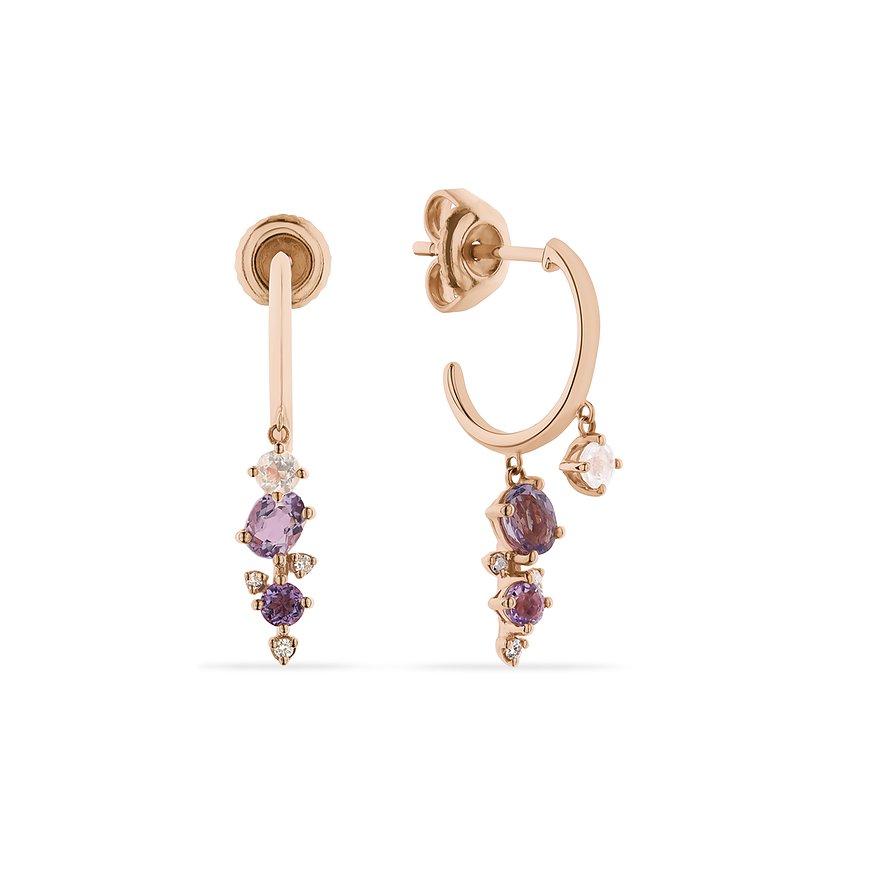 Für mehr Farbe im Daily Lifestyle! An den Creolen hängen lila und rosa Steine, die eine intensive Wirkung ausstrahlen. Die Ohrringe aus Roségold 375 halten einen Anhänger mit runden und ovalen Farbsteinen: Rosenquarz und Amethyst in verschiedenen Größen funkeln im Licht. Vorne, etwas weiter oben, hängt ein einzelner, runder Quarzstein an dem 3/4-Kreis. Ein feminines Schmuckdesign von CHRIST mit leicht verspielter Note.