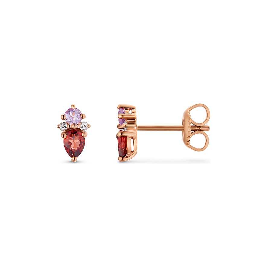 Modern, edel, luxuriös – diese Ohrstecker von CHRIST sind etwas ganz Besonderes. Das Design spielt gekonnt mit Farben und Formen: Je ein roter Granat, ein rosa Amethyst und zwei Topase wirken zusammen wie stilisierte Käfer. Oder sind es Blumen? Es ist genau diese Interpretationsvielfalt, die den Reiz der Schmuckstücke ausmacht. Gehalten werden die Steine von Fassungen aus 375er Roségold. Mit ihrer dezenten Größe passen die Ohrstecker zu allen Anlässen – besonders gut kommen sie zu einfarbigen, eleganten Outfits zur Geltung.