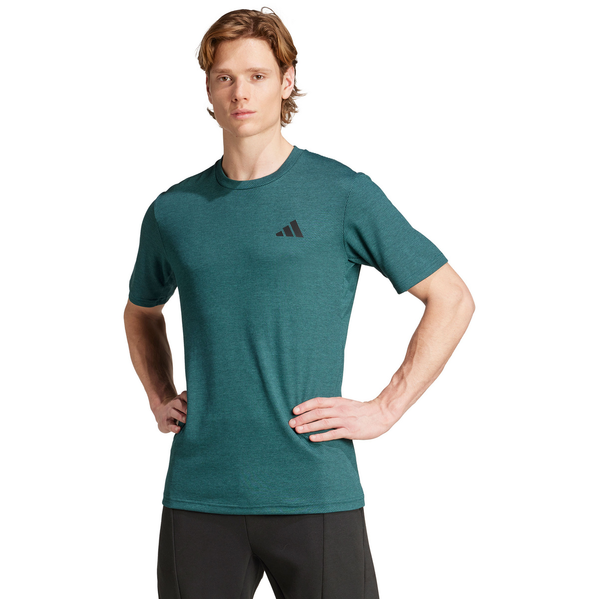 Das Feelready Novelty T-Shirt von adidas ist die perfekte Wahl für intensive Trainingseinheiten. Mit dem angenehm weichen Gewebemix aus recycelter Kunstfaser und Baumwolle, bietet es ein komfortables Tragegefühl mit gleichzeitig technischer Funktion. Die integrierte CLIMACOOL-Technologie sorgt für ein durchgehend kühles und trockenes Körperklima. Durch das effiziente Feuchtigkeitsmanagement leitet das Shirt Schweiß zuverlässig von der Haut ab und sorgt damit für ein angenehm trockenes Tragegefühl beim Training. Durch seinen regulären Schnitt und die elastische Materialstruktur lässt sich das Shirt besonders angenehm tragen. Es schmiegt sich bewegungsfreundlich an den Körper an, ohne einzuengen, und macht jede Bewegung mühelos mit. Ob für intensive Laufeinheiten oder Trainingseinheiten im Studio – das Feelready Novelty T-Shirt von adidas eignet sich dafür perfekt.