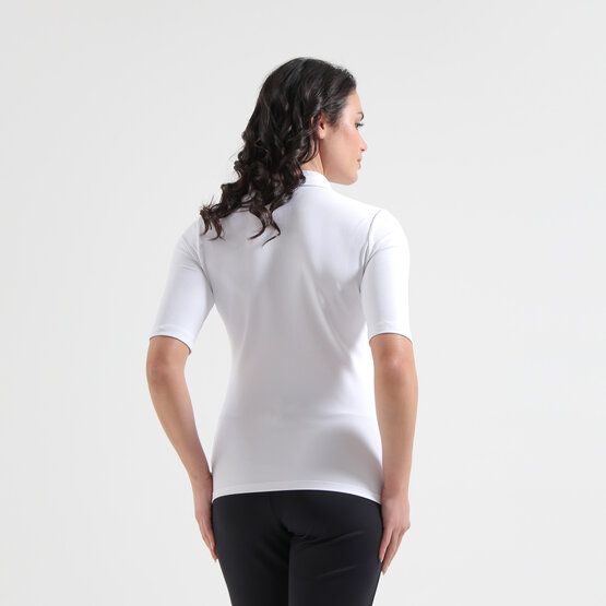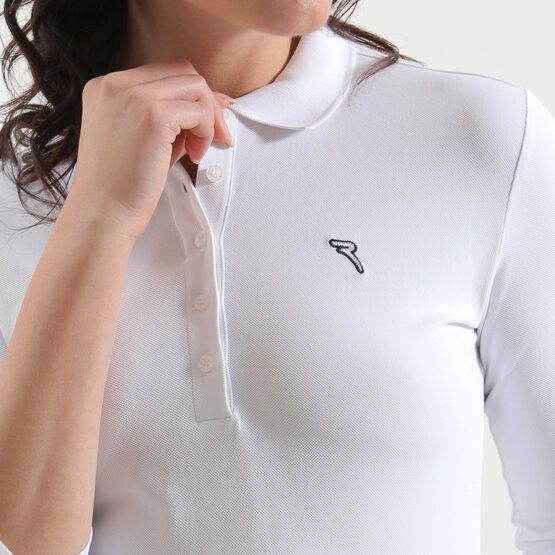 Poloshirt für Damen von der Marke Chervo. Das Funktionsmaterial ist atmungsaktiv, schnelltrocknend und feuchtigkeitsabweisend. Ausgestattet mit einem klassischen Polokragen und einer Knopfleiste. Chervo Damen Golfmode Funktionsmaterial Informationen zum Model (Kompletter Look / Shop the Look): Model-Größe: 175 cm Brust: 86 cm Taille: 60 cm Hüfte: 90 cm Das Model trägt den Artikel in der Größe 34/S
