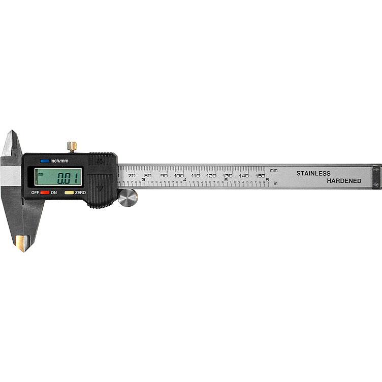 BGS Digital-Messschieber 150 mm Präzisions-Schieblehre mit digitaler Anzeige bis 150 mm bzw. 6 Zoll.Details: Mit extra grossem Display Mit Skala mm/Inch, Nonius 1/100 mm anzeigend Einstellbare 0-Position und mm/Inch Einstellung Die Werte können aber auch weiterhin direkt an der Skala abgelesen werden Batterie (2x LR44) im Lieferumfang enthalten In der aufklappbaren Aufbewahrungsbox Maße (ca.):Länge x Breite x Höhe Box: 250 x 91 x 26 mmLänge x Breite x Höhe Messschieber: 238 x 78 x 15 mmGewicht mit/ohne Box: 320/155 g Preis pro Stück