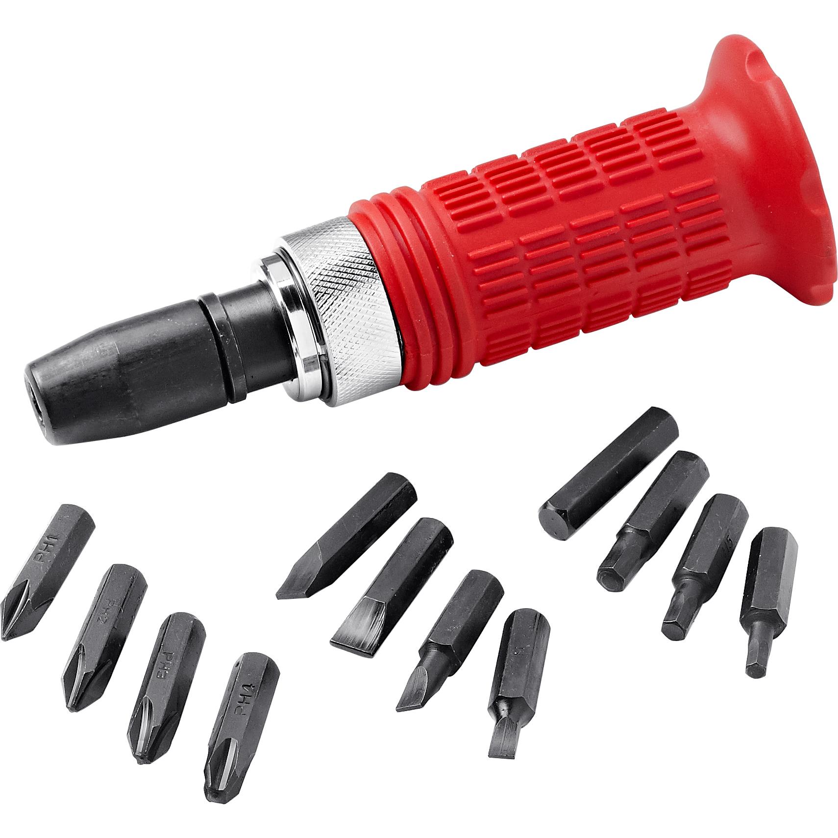 BGS Hand-Schlagschrauber 12,5mm (1/2″) mit 12 Bits Zum Lösen festsitzender Schrauben. Details: Griffstück mit Handschutz Durch den Schlag mit einem schweren Hammer wir das Bit im Halter und damit die Schraube gedreht Gleichzeitig löst der Druck die Schraube vom Gewindegang und fixiert das Bit im Schraubenkopf Bit mit 8mm Aussen-Sechskant in den folgenden Größe: Schlitz: 5 – 6 – 8 – 9 mm Kreuzschlitz: PH1 – PH2 – PH3 – PH4 Aussen-Sechskant für Innensechskant: 4 – 5 – 6 – 8 mm Der Bithalter kann abgenommen werden und statt dessen Steckschlüssel für 1/2″ Knarren aufgenommen werden Maße (ca.):Länge ohne Bits: 155 mmØ Griff: 36 mmGewicht: 800 g Preis pro Stück