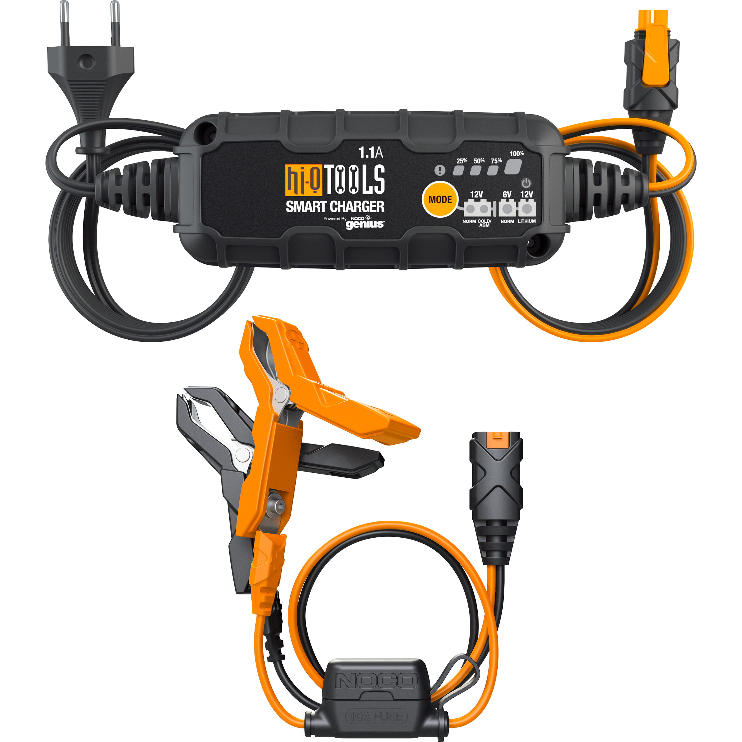 Hi-Q Tools Batterieladegerät PM1100 Canbus, 6/12V 1,1A, für Blei-Säure und Lithium CANBUS-fähiges Ladegerät mit Frischhaltefunktion für 6 Volt und 12 Volt Blei-Säure Batterien (WET, MF, AGM und Gel) UND Lithium LiFePo4 Batterien. Ihr könnt also mit diesem Ladegerät die Batterie bei Bedarf laden oder bei längerer Standzeit (z.B. über den Winter) angeschlossen lassen und damit die Lebensdauer der Batterie verlängern.Eignet sich besonders für kleinere und mittelgroße Batterien auch bei Oldtimern, PKW, Jetski, Rasenmäher, Motorschlitten usw. Details: mit einem Ladegerät könnt Ihr also fast jede Starterbatterie am Markt laden Zukunftssicher: auch wenn Ihr irgendwann mal ein Motorrad mit einer (serienmäßigen?) Lithium-Batterie habt könnt Ihr das Ladegerät weiter verwenden über den Modetaster könnt Ihr einstellen ob eine Batterie mit 12 Volt, 6 Volt oder eine Lithium-Batterie angeschlossen ist für eine 12 Volt AGM Batterie kann noch ein spezieller Ladezyklus ausgewählt werden es prüft den Ladezustand der Batterie und startet automatisch den optimalen Ladeprozess bzw. den Frischhaltemodus eingebauter Batteriedesulfator zur Wiederherstellung verbrauchter Batterien, kann also auch tief entladene Batterien ab 2 Volt Spannung wieder reaktivieren wenn dort kein Schaden vorliegt bei den meisten Modellen mit CANBUS auch zum Anschluss an die Original-Bordsteckdose geeignet (z.B. für BMW, Ducati, Triumph und Harley-Davidson) – einen passenden Adapter benötigt Ihr ggf. zusätzlich (siehe Optionen) also einfach Anschließen und bis zur Fahrzeugnutzung vergessen – alles dazwischen macht das Ladegerät selbstständig inklusive abnehmbarer Krokodilklemmen welche an Ringösen befestigt sind die auch alternativ direkt an die Batteriepole verschraubt werden können das ist besonders praktisch wenn die Batterie schwer zugänglich ist die Verbindung zum Ladegerät erfolgt über einen X-Connect Stecker – das erlaubt auch den Anschluss von weiteren Zubehör (siehe Optionen) wird die X-Connect Steckdose fest an die Batterie verschraubt kann sie mit einer Gummiabdeckung verschlossen werden das Gehäuse kann über zwei Halteösen z.B. an der Wand fixiert werden (Innendurchmesser 4 mm) extra lange Kabel um unabhängiger von der Steckdosenposition agieren zu können Eingangsspannung 100V-240V AC, 50-60Hz, Verbrauch maximal 30 Watt Ladestrom bis zu 1100mA – geeignet für Batterien bis 40 Ah, Frischhaltefunktion für Batterien bis 120 Ah Schutzart: IP65 Maße (ca.):Länge x Breite x Höhe Gehäuse: 153 x 64 x 40 mmBreite Krokodilklemmen Metall/mit Kunststoff: 12/15 mmKabellänge Gerät bis Steckdose: 204 cmKabellänge Gerät bis X-Connect Stecker: 140 cmKabellänge Connect Stecker bis Batterieanschlussösen: 56 cmKabellänge Connect Stecker bis Spitze Krokodilklemmen: 64 cmØ Ringöse: 6,5 mm (M6)Gewicht: 530 g Optionen: zusätzliches Batterieanschlusskabel mit X-Connect Steckdose und Krokodilklemmen wie es schon 1x im Lieferumfang enthalten ist für weitere Fahrzeuge (Bestellnummer 50020000920) Adapter zum Laden über vorhandene DIN-Bordsteckdosen (z.B. bei BMW) oder Zigarettenanzünderdose mit X-Connect Steckdose (Bestellnummer 50020000923) Verlängerungskabel mit X-Connect Stecker und Steckdose (Bestellnummer 50020000922) Ladestandanzeige per App auf dem Smartphone oder Tablet (Bestellnummer 50020000570) Kabelverteilerset wenn schon zu viele Anschlüsse direkt an der Batterie vorhanden sind oder deren Pole schlecht zugänglich sind (Bestellnummer 50220000550) Preis pro Stück WEEE-Reg.-Nr. DE 33922893