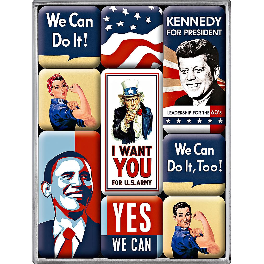 Magnet-Set United States of America Es gibt Kühlschränke, an denen unzählige Magnete unzählige Notizzettelchen befestigen. Unsere Magnete schaffen Ordnung unter Ihren Notizzetteln, egal ob am Kühlschrank, einer Lampe (mit Metallschirm) oder einer Magnetwand. Durch den vollflächigen Kraftmagneten auf der Rückseite ist gewährleistet, dass auch mehrere Zettel fest an Ort und Stelle bleiben. Der dekorative Aufdruck sorgt für eine angenehme Verschönerung in Küche, Büro und Kinderzimmer. 9 teiliges Magnet-Set mit hochwertiger glänzender Oberfläche inkl. praktischer Geschenk-Box. Maße: 8 x 6 cm