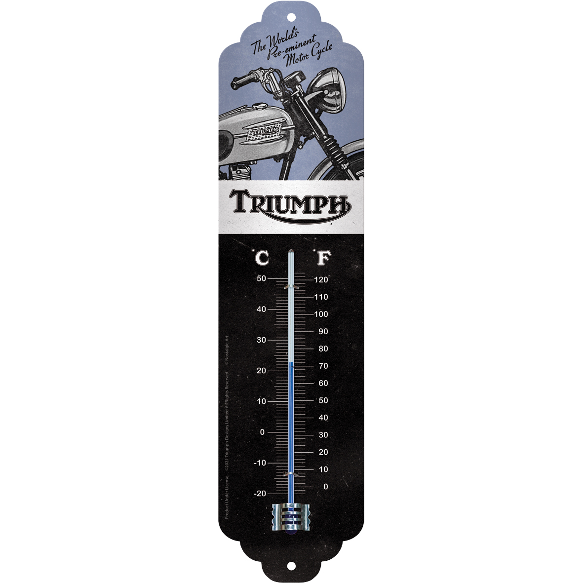 Nostalgic-Art Thermometer Triumph – Motorcycle blue Details: Extra starkes Stahlblech Skala in Celsius und Fahrenheit Robuste Kartonverpackung Format: 6,5 x 28 cm