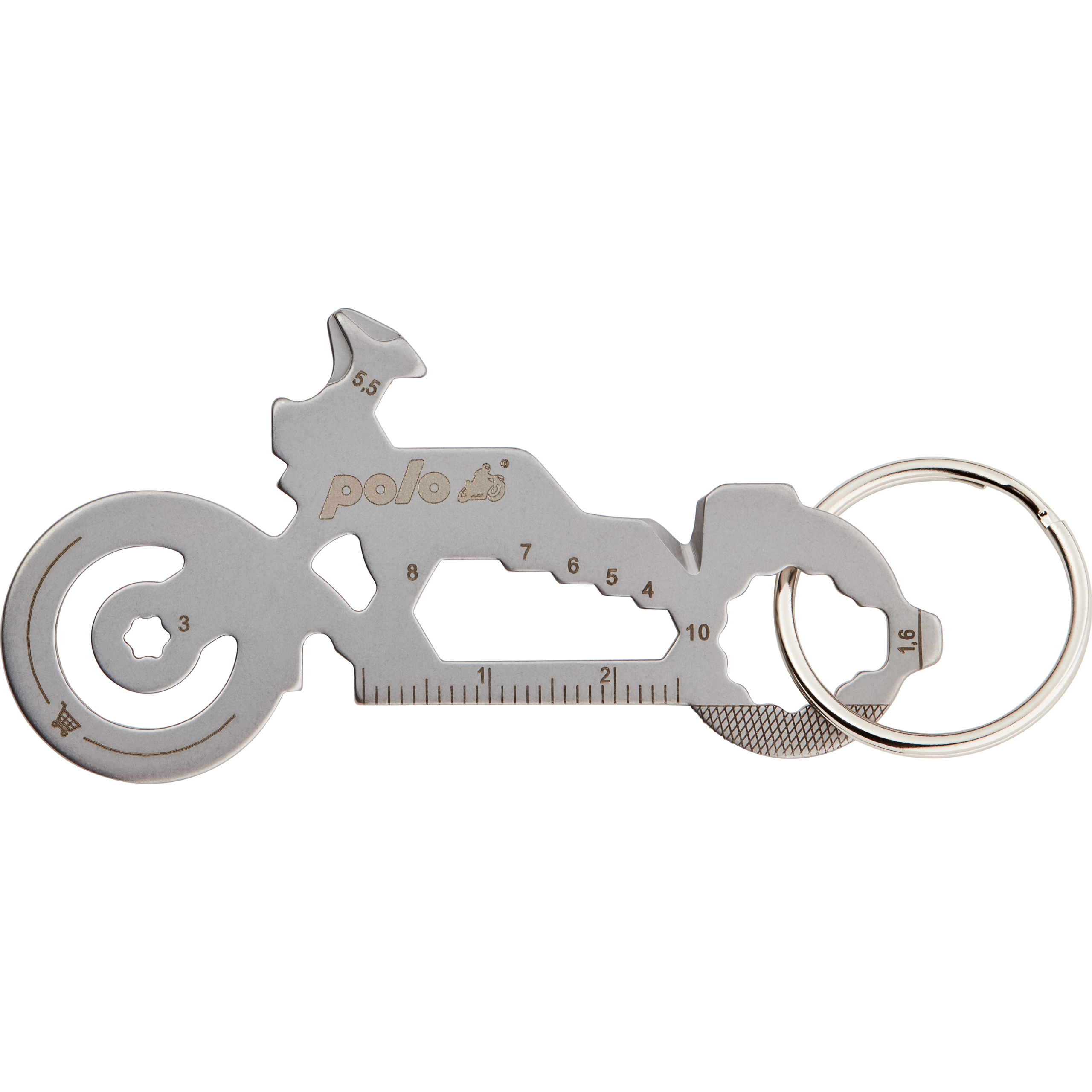 POLO Biker Multi Tool Das Multifunktionswerkzeug für den Schlüsselbund. Mit dem hochwertigen Begleiter aus Edelstahl habt ihr die wichtigsten Werkzeuge wie Schraubendreher, Lineal oder Sechskantschlüssel immer dabei – im Alltag, Büro oder auf Reisen. Funktionen: Großer Schlitzschraubendreher Kleiner Schlitzschraubendreher Einkaufswagenlöser Speichenvierkant (3.5 / 4.1) Kreuzschlitz-Schraubendreher Flaschenöffner Sechskantschlüssel (4 / 5 / 5,5 / 6 / 7 / 8) Kabelzieher Sechskantschlüssel (3 / 10) Nagelzieher Lineal (cm / inch) Nagelfeile Reifenprofilmesser Maße (ca.): Breite x Höhe x Tiefe (ohne Schlüsselring) 7,5 x 3,8 x 0,2 cm Gewicht (ohne Schlüsselring) 17 g Ø Schlüsselring 2,5 cm Preis pro Stück