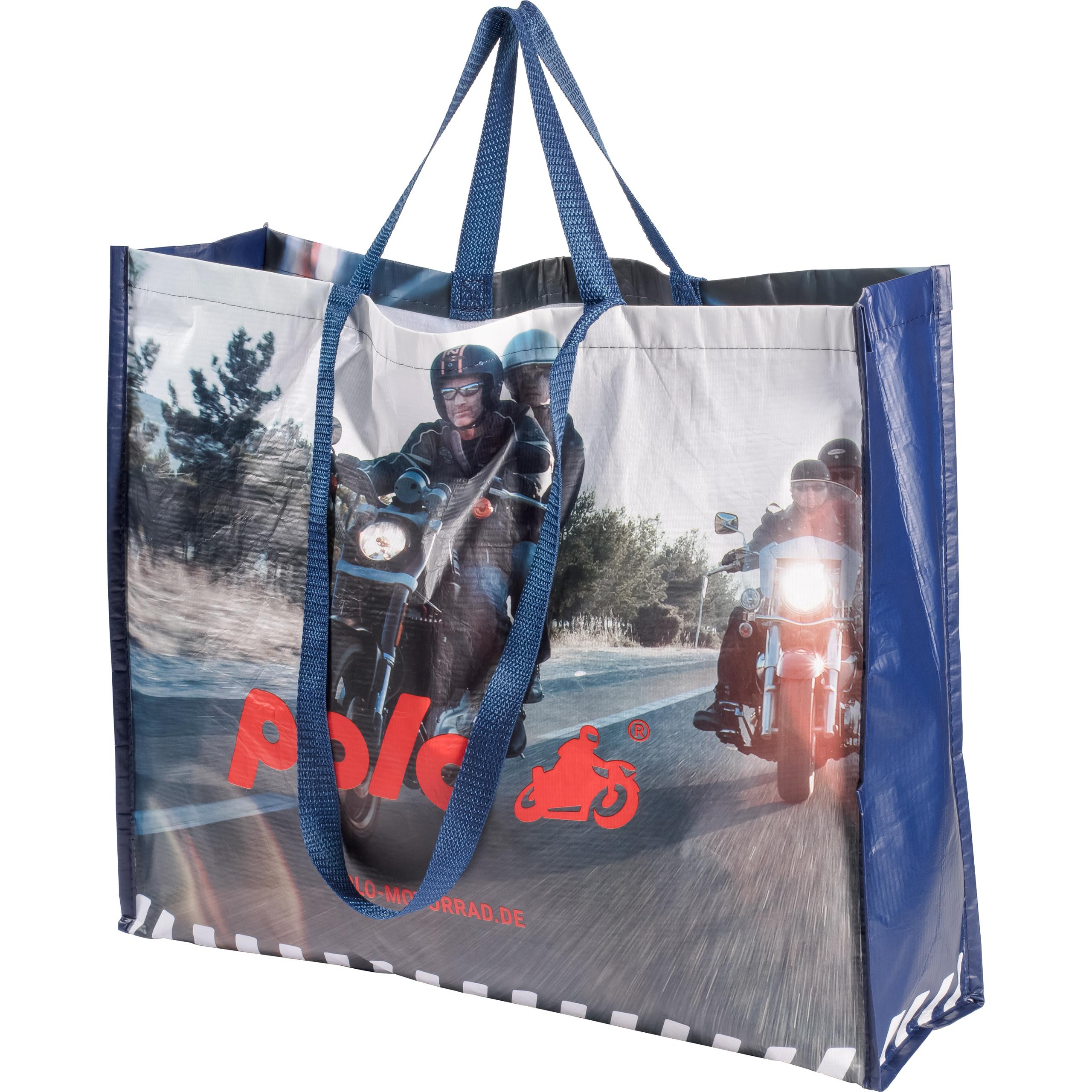 POLO R-PET Tragetasche, groß Die sensitive Alternative zu den raueren PP Woven Taschen Tragetasche aus recyceltem PET mit Aufdruck Wasserabweisend, strapazierfähig und sehr stabil Umweltfreundlich und mehrfach wiederverwendbar Mit 4 eingenähten Trageschlaufen (2x ca. 45 cm Länge, 2x ca. 90 cm Länge) Maße B/H/T ca. 55 x 45 x 15 cm Ca. 40 Liter Stauraum Material: 100 % recyceltes PET-Material