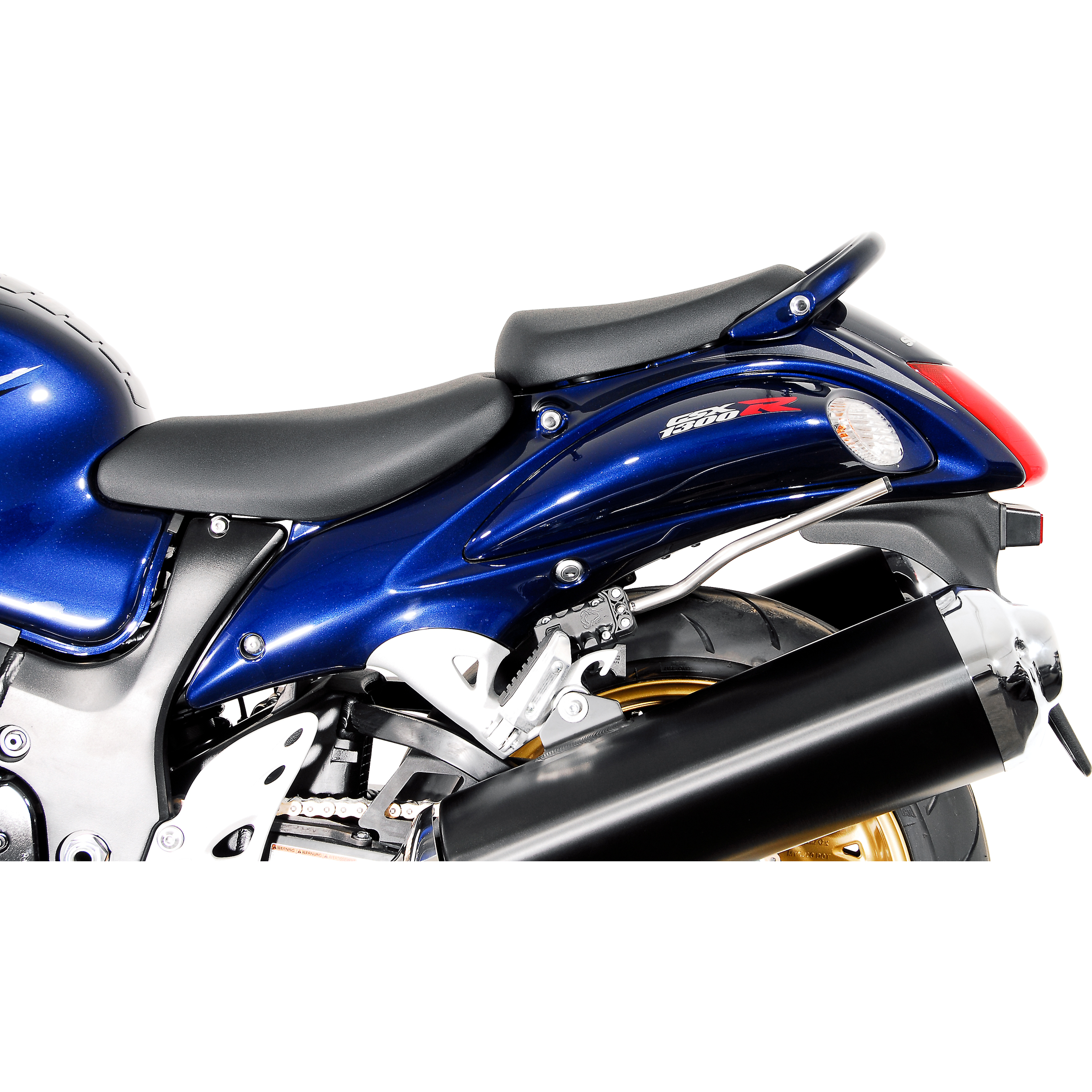 QUICK-LOCK Trägerarme für Blaze Satteltaschen Ermöglichen die Verwendung der Blaze und Blaze PRO Satteltaschen. Details: Haltearme zur Montage an den Soziusrastenhaltern Bei Nichtgebrauch ist der eigentliche Arm in sekundenschnelle abnehmbar Es verbleibt nur die Aufnahme an den Soziusrasten Trägerarme für Blaze nur passend für die niedriger positionierten Blaze und Blaze PRO Satteltaschen!! Trägerarme für Blaze H nur passend für die höher positionierten Blaze H und Blaze PRO H Satteltaschen!! ACHTUNG: Trägerarme und Taschen können nur gemeinsam verwendet und bestellt werden – mit anderen Taschen funktionieren diese nicht!! Optionen: Satteltaschenpaar Blaze mit höher positionierter Querverbindung (tiefer positionierte Taschen) passend für die Trägerarme (Bestellnummer 70250500050) Satteltaschenpaar Blaze H mit tiefer positionierter Querverbindung (höher positionierte Taschen) passend für die Trägerarme H (Bestell-Nr. 70250500051) Satteltaschenpaar Blaze PRO mit höher positionierter Querverbindung (tiefer positionierte Taschen) passend für die Trägerarme (Bestellnummer 70250500160) Satteltaschenpaar Blaze PRO H mit tiefer positionierter Querverbindung (höher positionierte Taschen) passend für die Trägerarme H (Bestell-Nr. 70250500161) Zulassung:Satteltaschen und deren Halter müssen nicht zugelassen werden, benötigen deshalb auch keine Prüfzeichen, Gutachten oder ABE´s. Preis pro Satz für beide Fahrzeugseiten (ohne Taschen) Montage Blaze Satteltaschen an modellspezifischen Trägerarmen: die Trägerarme werden wie in deren modellspezifischen Anbauanleitung beschrieben ans Fahrzeug befestigt werden die Taschen nicht genutzt verbleiben nur recht kleine Aufnahmeblöcke am Motorrad (meist am Träger der Soziusfußrasten) bitte bei der Montage dieser Blöcke das Gegenstück der Klickverschlüsse dieser Taschen (gehören zu den Taschen) mit verschrauben stecken Sie die dort dazu gehörenden QUICK-LOCK Arme in diese Aufnahmeblöcke nun die Taschen mit den Einschubfächern von hinten um diese Arme schieben danach die Klett-Querverbindung so einstellen, dass die Taschen straff am Heck sitzen (ist das einmal eingestellt kann bei weiteren Befestigungen darauf verzichtet werden) als letztes die Klickbefestigungsriemen vorne an den Taschen in deren Aufnahmen an den Aufnahmeblöcken stecken und straff ziehen die Gurtenden bitte gegen Flattern sichern – Klettbänder dafür befinden sich an deren Enden das ergibt einen festen flatterfreien Sitz werden die beiden Klickverschlüsse gelöst können die Taschen in Sekundenschnelle nach hinten abgenommen werden auf die Montage geht dann wieder ähnlich schnell bitte generell immer auf den ersten Fahrten oder bei neuer Beladung zunächst vorsichtig die Geschwindigkeit steigern