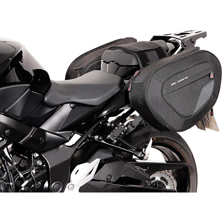 QUICK-LOCK Trägerarme für Blaze Satteltaschen Ermöglichen die Verwendung der Blaze und Blaze PRO Satteltaschen. Details: Haltearme zur Montage an den Soziusrastenhaltern Bei Nichtgebrauch ist der eigentliche Arm in sekundenschnelle abnehmbar Es verbleibt nur die Aufnahme an den Soziusrasten Trägerarme für Blaze nur passend für die niedriger positionierten Blaze und Blaze PRO Satteltaschen!! Trägerarme für Blaze H nur passend für die höher positionierten Blaze H und Blaze PRO H Satteltaschen!! ACHTUNG: Trägerarme und Taschen können nur gemeinsam verwendet und bestellt werden – mit anderen Taschen funktionieren diese nicht!! Optionen: Satteltaschenpaar Blaze mit höher positionierter Querverbindung (tiefer positionierte Taschen) passend für die Trägerarme (Bestellnummer 70250500050) Satteltaschenpaar Blaze H mit tiefer positionierter Querverbindung (höher positionierte Taschen) passend für die Trägerarme H (Bestell-Nr. 70250500051) Satteltaschenpaar Blaze PRO mit höher positionierter Querverbindung (tiefer positionierte Taschen) passend für die Trägerarme (Bestellnummer 70250500160) Satteltaschenpaar Blaze PRO H mit tiefer positionierter Querverbindung (höher positionierte Taschen) passend für die Trägerarme H (Bestell-Nr. 70250500161) Zulassung:Satteltaschen und deren Halter müssen nicht zugelassen werden, benötigen deshalb auch keine Prüfzeichen, Gutachten oder ABE´s. Preis pro Satz für beide Fahrzeugseiten (ohne Taschen) Montage Blaze Satteltaschen an modellspezifischen Trägerarmen: die Trägerarme werden wie in deren modellspezifischen Anbauanleitung beschrieben ans Fahrzeug befestigt werden die Taschen nicht genutzt verbleiben nur recht kleine Aufnahmeblöcke am Motorrad (meist am Träger der Soziusfußrasten) bitte bei der Montage dieser Blöcke das Gegenstück der Klickverschlüsse dieser Taschen (gehören zu den Taschen) mit verschrauben stecken Sie die dort dazu gehörenden QUICK-LOCK Arme in diese Aufnahmeblöcke nun die Taschen mit den Einschubfächern von hinten um diese Arme schieben danach die Klett-Querverbindung so einstellen, dass die Taschen straff am Heck sitzen (ist das einmal eingestellt kann bei weiteren Befestigungen darauf verzichtet werden) als letztes die Klickbefestigungsriemen vorne an den Taschen in deren Aufnahmen an den Aufnahmeblöcken stecken und straff ziehen die Gurtenden bitte gegen Flattern sichern – Klettbänder dafür befinden sich an deren Enden das ergibt einen festen flatterfreien Sitz werden die beiden Klickverschlüsse gelöst können die Taschen in Sekundenschnelle nach hinten abgenommen werden auf die Montage geht dann wieder ähnlich schnell bitte generell immer auf den ersten Fahrten oder bei neuer Beladung zunächst vorsichtig die Geschwindigkeit steigern