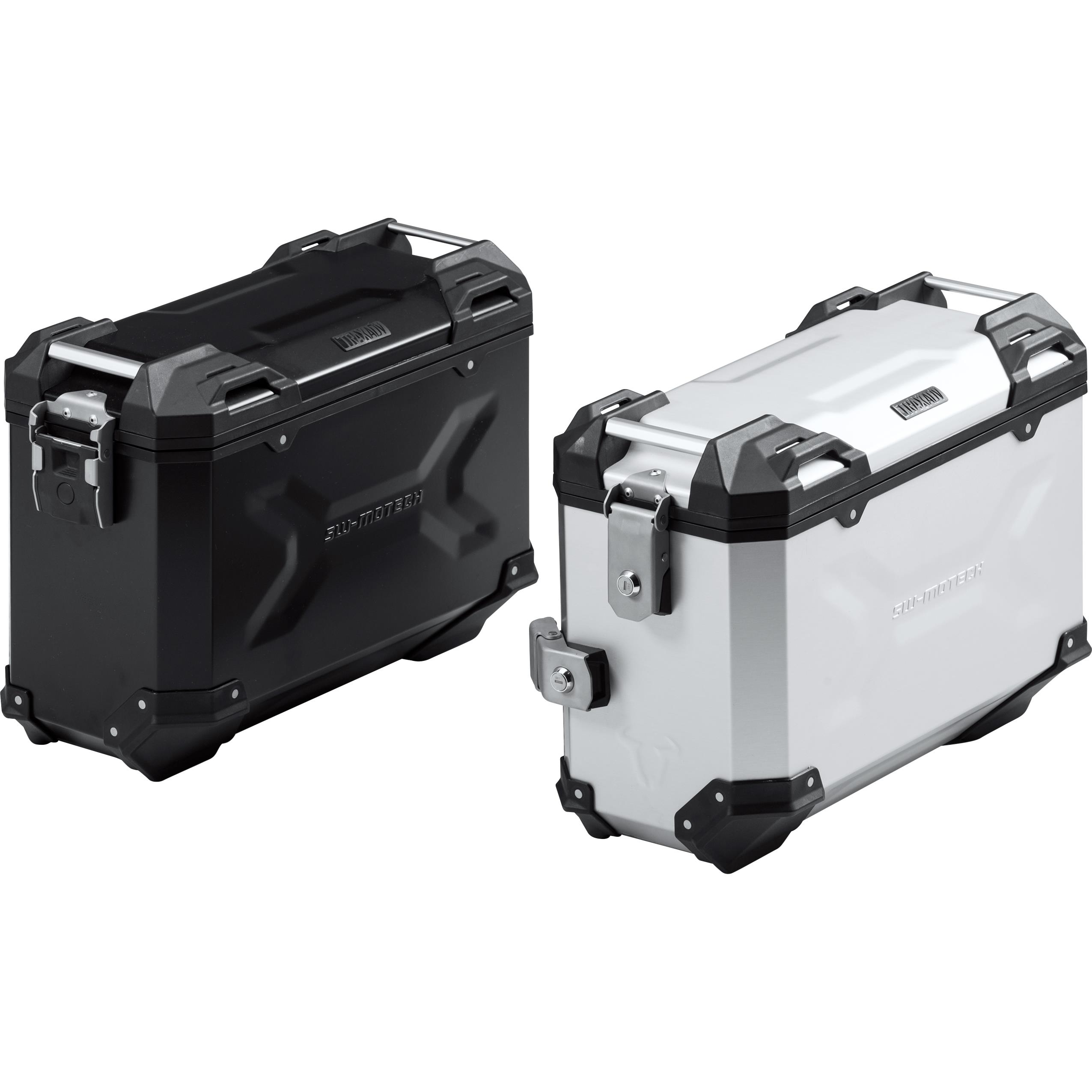 SW-Motech TraX Adventure Alu Seitenkoffer Extrem robuste und wasserdichte Top-Loader Aluminium Seitenkoffer. Details: silber eloxiert oder schwarz pulverbeschichtet – also bestens vor Witterung geschützt und kein Aluminiumabrieb am Inhalt wie bei vielen anderen Alukoffern robotergestütztes Schweißen und Stanznieten verhindern Eindringen von Staub und Wasser hohe Stabilität durch Designprägungen des 1,5 mm starken Aluminium tiefgezogenen Deckel und geschweißte Kanten abgeschrägte Seitenkanten für hohe Bodenfreiheit bei Kurvenfahrten zusätzlicher Schutz durch Ecken aus glasfaserverstärktem Kunststoff aufklappbarer Top-Loader-Deckel kann auch mit Schnellverschluss und Öffnungsbegrenzer komplett abgenommen werden vier stabile, in das Deckeldesign integrierte Verzurrpunkte ermöglichen den zusätzlichen Transport weiteren Gepäcks auf dem Kofferdeckel mit eloxierten Aluminium-Tragegriffen Lieferung erfolgt ohne Schlösser – bitte diese zusätzlich mitbestellen (4er Satz wenn nur Seitenkoffer, 6er Satz wenn auch ein Topcase verwendet werden soll) mit entsprechenden Adapter für alle Quick-Lock (ausser Kontour), Givi Monokey oder Hepco & Becker Seitenkofferträger passend Maße:M und L Version unterscheiden sich nur von der BreiteM:37 Liter StauraumLänge x Breite x Höhe 49 x 23 x 37 cm L:45 Liter Stauraum – meist für einen Helm passend, bei kleinen Helmen sogar für zweiLänge x Breite x Höhe 49 x 28 x 37 cm Optionen: passendes Topcase (70200210000 oder 70200210001) gleichschließendes Schloßkit für zwei oder drei Koffer (70210100004 oder 70210100003) Adapter für Seitenträger (70000001130, 70000001131,70210100070 oder 70210100080) TRAX GEAR+ Kofferinnentasche (70210100190) TRAX GEAR+ Tasche für die Innenseite des Deckels (70210100210) TRAX GEAR+ Gepäcknetz für die Innenseite des Deckels (70210100230 oder 70210100231) TRAX GEAR+ wasserdichte Aufsatztasche für den Deckel (70210100220) Campingtisch für die Montage auf den Kofferdeckeln (70210100240) optional mit separaten Tischbeinen (70210100250) zur Nutzung mit nur einem Koffer oder ganz ohne Koffer Universalhalter für Zubehör (70210100140) Flaschenkit für den Universalhalter (70210100150 oder 70210100151) Kanisterkit für den Universalhalter (70210100170) Zulassung:Koffer müssen nicht zugelassen werden, benötigen deshalb auch keine Prüfzeichen, Gutachten oder ABE´s. Preis pro Stück
