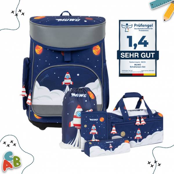 Marke MUWO Schulrucksack 5erSet bestehend aus Ranzen Sporttasche Turnbeutel Federmappe und Schlampermäppchen Schulrucksack ultraleicht mit einem Leergewicht von 920 Gramm Maße (HxBxT) ca. 40 x 30 x 15 cm Volumen ca. 20 L Material 100% Polyester Verschluss Deckelschnalle kinderleichtes Öffnen durch Ziehen an der Lasche wasser und schmutzabweisend leicht zu reinigen ergonomischer Tragekomfort gepolstertes Rückenteil ergonomische breite Schulterträger mit verstellbarem Zwischengurt geräumiges Ha…