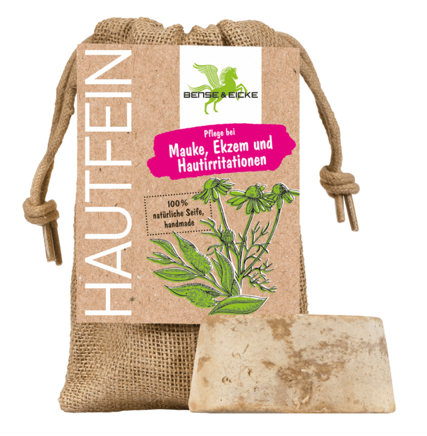 HautFein von Bense & Eicke ist eine 100 % natürliche Seife – reinigt und pflegt irritierte Hautpartien. Mit wertvoller, hautberuhigender Pflegeformel aus Olivenöl, Kokosöl, Jojobaöl, Teebaumöl, Kamille und Heilerde. Auch zur unterstützenden Pflege bei Mauke und Sommerekzem. Alle Vorteile auf einen Blick: reinigt und pflegt irritierte Haupartien umweltfreundliche Verpackung im Jute-Beutel unterstützenden Pflege bei Mauke und Sommerekzem Anwendung: In das nasse Haar/Fell einschäumen (Seife kann auch im Sack verwendet werden), 3-4 Minuten einwirken lassen, danach ausspülen. Bei akutem Bedarf 1-2x täglich anwenden. Inhaltsstoffe: Olea europaea oil, Cocos nucifera oil, , Carthamus tinctorius oil, Helianthus annus oil, Sodium hydroxide, Aqua, Loess, Simmondsia chinesis oil, Chamomilla recutita, äth. Öl, Limonene.