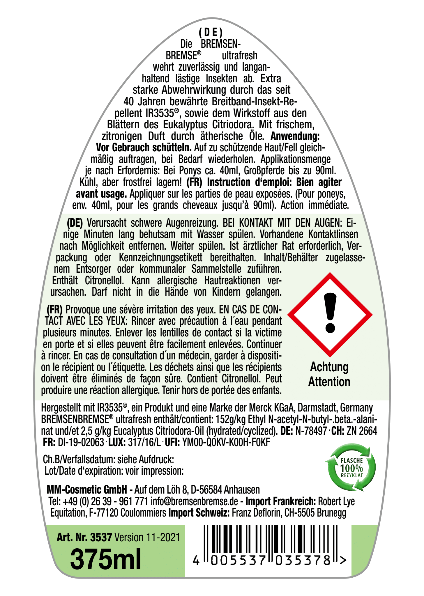 Insektenschutz – ultrafresh von BREMSENBREMSE: Effektiver Schutz für Pferde BREMSENBREMSE Insektenschutz – ultrafresh bietet vielseitigen Einsatz im Reitsport. Ideal für den Schutz von Pferden und Reitern. Erhältlich in verschiedenen Verpackungsgrößen, um individuellen Bedürfnissen gerecht zu werden. Zusammensetzung und Eigenschaften Der BREMSENBREMSE Insektenschutz – ultrafresh ist in flüssiger Form erhältlich und besteht aus sorgfältig ausgewählten Inhaltsstoffen. Die Darreichungsform ermöglicht eine einfache Anwendung. Du kannst zwischen den Verpackungsgrößen 750 ml, 375 ml und 3000 ml wählen. Es wurde speziell für den Reitsportbereich entwickelt. Anwendung und Dosierung Trage den Insektenschutz gleichmäßig auf die gewünschten Stellen auf. Die Flasche ermöglicht eine einfache und präzise Dosierung. Geeignet für die Anwendung im Freien während des Reitens oder im Stall. Vermeide den Kontakt mit Augen und Schleimhäuten, um eine optimale Nutzung zu gewährleisten. Praktische Informationen Bewahre das Produkt an einem kühlen, trockenen Ort auf, um die Haltbarkeit zu maximieren. Die Verpackung ist benutzerfreundlich und handlich, ideal für unterwegs. BREMSENBREMSE steht für Qualität und Zuverlässigkeit im Reitsportbereich. Beachte die Anwendungshinweise für eine optimale Nutzung. * Flüssige Darreichungsform * Einfache Anwendung * Verschiedene Verpackungsgrößen * Speziell für Reitsport * Benutzerfreundliche Verpackung