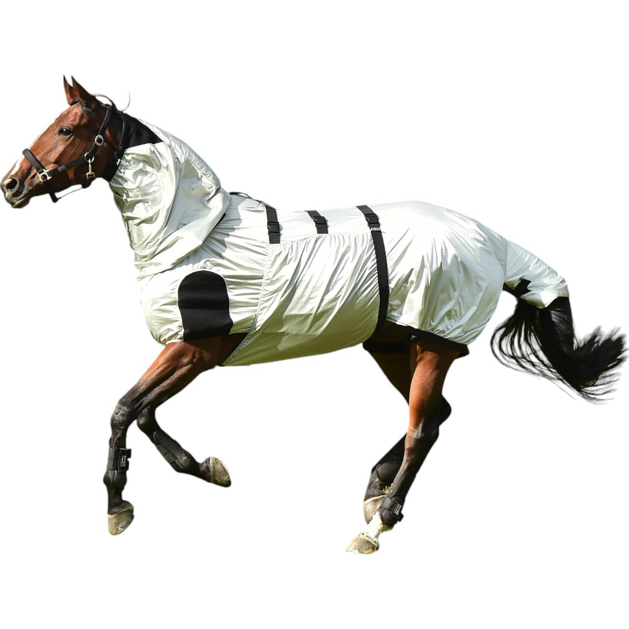 * spezielle Schutzdecke für Pferde mit Sommerekzem Material/Materialfunktion: * aus schnelltrocknendem und strapazierfähigem Polyestermaterial * atmungsaktiv Passform/Ausstattung: * gute Liegeeigenschaften durch ausgereifte Passform * elastischer Bewegungseinsatz im Schulterbereich * Widerristbereich mit Softfleece unterlegt * fest integriertes Halsteil mit einstellbarem Umfang am Halsansatz/Schulterbereich und elastischem, engem und einstellbarem Kopfabschluss * Bauchlatz mit längeneinstellbarer, elastischer Dreifach-Begurtung und längeneinstellbarem Brustgurt * elastische, längeneinstellbare Hinterbeinbegurtung mit Softfleece-Schoner * große Schweifabdeckung mit Klettfixierung