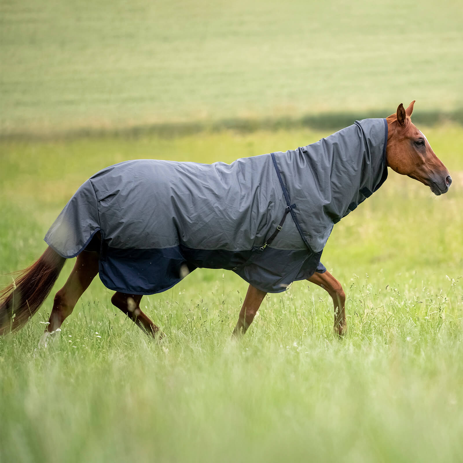 * optimaler Outdoor-Komfort für dein Pferd: Regendecke mit nur sehr leichter Isolierung zur Klimaregulierung und Vermeidung von Kondensfeuchtigkeit bei ganzjähriger Nutzung * flexibel, individuell und situativ in vielfältigen Funktionsvarianten nutzbar durch die Kombinationsfähigkeit mit unterschiedlichen Linern und Halsteil – und damit die gesamte Deckensaison über einsetzbar Material/Materialfunktion: * äußerst strapazierfähiges, extra reißfestes und funktionserprobtes Außenmaterial: 840 den Nylon Double Ripstop * DRYsense-Lining: besonders fellfreundliches und schnelltrocknendes Polyestergewebe mit soft-trockener Haptik auch bei wetterbedingter hoher Luftfeuchtigkeit – Kondensfeuchtigkeit wird vermieden und die Decke wird von innen nicht klamm, auch wenn sie zwischendurch vom Pferd heruntergenommen wird * sehr leichte Wärmeisolierung: 50 g Polyfill * Obermaterial Atmungsaktivität: 3000 g/m²/24h * Obermaterial Wasserdichtigkeit: 5000 mm * winddicht Passform/Ausstattung: * Komfort-Brustdesign für optimalen Schulterabschluss und ausreichend Platz für die Buggelenke * V-Quick-Snap-Brustverschluss mit integriertem Doppelklett und auswechselbaren Karabinern * mit integriertem Klettsystem zur Anbringung eines Halsteils * mit integrierten Ösen zur Befestigung eines Liners * Widerristpolster aus synthetischem Kautschuk mit hautfreundlicher Jersey-Oberfläche * längeneinstellbare Kreuzbegurtung, angesetzt mit integrierter Elastikschlaufe * elastische Hinterhandfixierung mit Schmutzschutz * Befestigungsvorrichtung für Beingurte * gefütterte, großzügige Schweifabdeckung