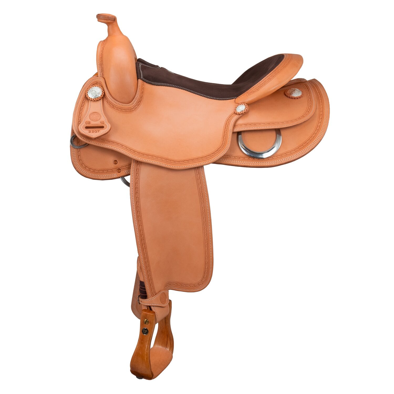 Vielseitig, robust und stilvoll Der SM Allrounder von Deuber & Partner ist ein vielseitiger Westernsattel aus der Pro Line, der sich ideal für Alltag, Freizeit, Training – und den Einstieg in den Turniersport – eignet. Mit seiner durchdachten Ausstattung und der robusten Verarbeitung ist er ein zuverlässiger Begleiter für Reiter, die Wert auf Qualität, Komfort und eine klassische Optik legen. Wie der Name schon sagt: ein echter Allrounder Gefertigt aus naturfarbenem Sattelleder mit Tan Kote Finish und weichem Nubuk-Polsterleder in Braun, verbindet dieser Sattel funktionale Schlichtheit mit stilvollen Details. Die markanten weißen Nähte sorgen für einen dezenten Kontrast, während die doppelte Nahtausführung im Skirt- und Sitzbereich die Langlebigkeit zusätzlich unterstützt. Die Gurtung erfolgt über ein C-Ring Inskirt Rigging in 7/8-Position. Die Fender in Größe M bestehen aus riemenverstärktem Leder und sind mit stabilen Holzsteigbügeln ausgestattet – komfortabel und belastbar zugleich. Ergänzt wird die Ausstattung durch Latigo-Tie-Strap und Off-Billet, bekannt für ihre hohe Reißfestigkeit. Optisch überzeugt der SM Allrounder mit liebevoll gearbeiteten Oklahoma Conchos, dezentem Bordertooling und einem klassischen Lederhorn.