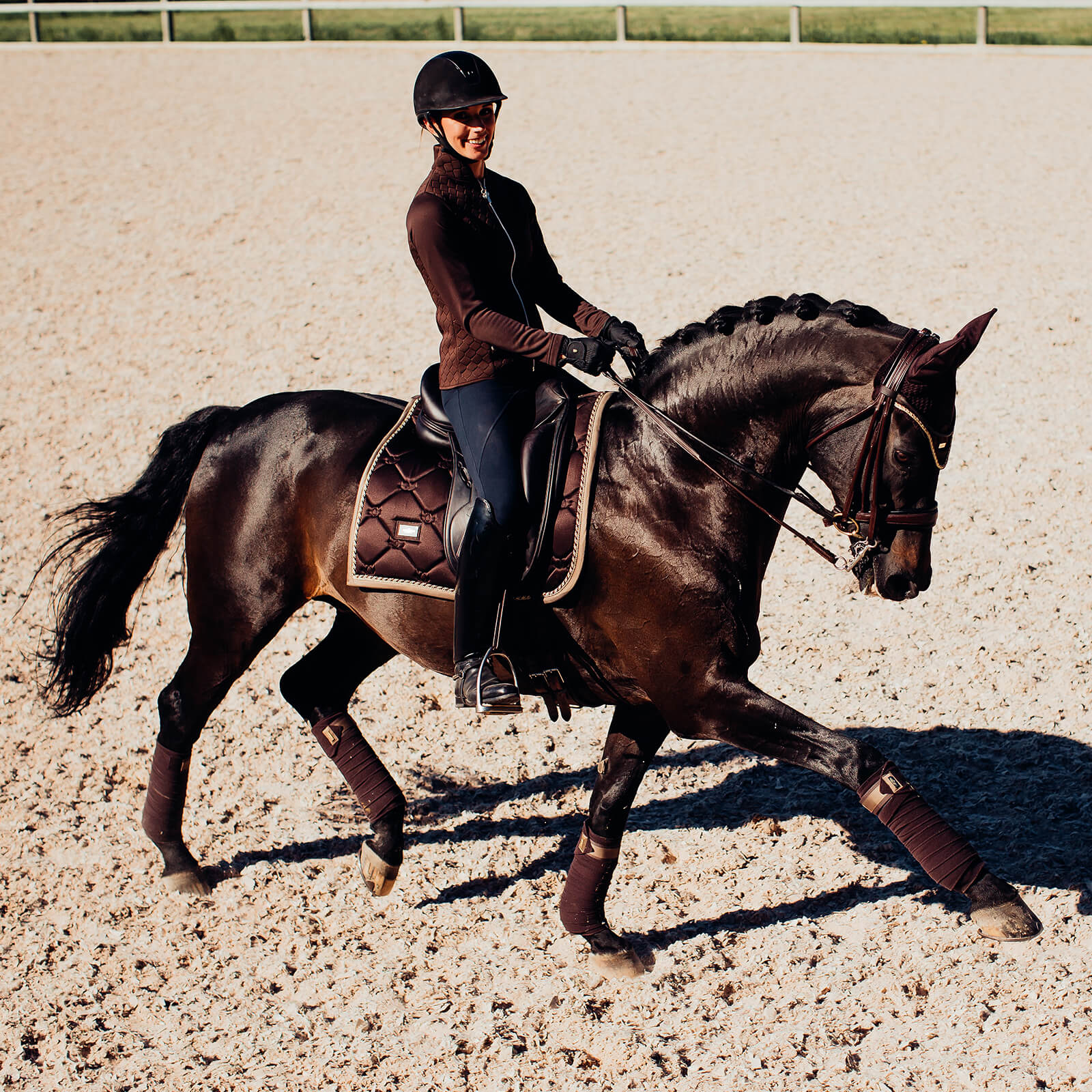 Dressurschabracke Golden Brown – Eleganz und Funktionalität vereint Dressurschabracke Golden Brown von Equestrian Stockholm ist die perfekte Wahl für anspruchsvolle Reiter, die stilvolle Eleganz mit herausragender Funktionalität verbinden möchten. Ihr glänzendes Dunkelbraun zieht alle Blicke auf sich, während das innovative Material dein Pferd optimal unterstützt und trocken hält. Stilvolles Design für deinen großen Auftritt Die Dressurschabracke besticht durch ihr glänzendes Dunkelbraun, das in jedem Dressurviereck für Aufmerksamkeit sorgt. Die goldenen Details und das markante Equestrian Stockholm Logo verleihen deinem Pferd eine edle Ausstrahlung. Die schmutzabweisende Oberfläche sorgt dafür, dass die Schabracke stets ihren luxuriösen Glanz behält, egal ob beim Training oder auf Turnieren. Technische Raffinesse für optimale Leistung Ausgestattet mit einer „Super Quick Dry“-Funktion bietet die Dressurschabracke Golden Brown höchste Atmungsaktivität. Das Innenmaterial leitet Feuchtigkeit effektiv ab und hält dein Pferd auch bei intensiven Trainingseinheiten angenehm trocken. Die durchdachte Materialkombination sorgt für einen optimalen Sitz und Komfort. Vielseitiger Einsatz und einfache Pflege Ob im Training oder auf dem Turnier, die Dressurschabracke Golden Brown ist dein verlässlicher Begleiter. Dank der hochwertigen Verarbeitung und des pflegeleichten Materials bleibt sie auch nach häufigem Einsatz in Topform. Erlebe die perfekte Kombination aus Stil und Funktion und bringe deine Dressur-Performance auf ein neues Level! * Glänzendes, schmutzabweisendes Material * Hoch atmungsaktiv mit „Super Quick Dry“-Funktion * Luxuriöse goldene Details und Equestrian Stockholm Logo * Perfekt abgestimmt auf die Equestrian Stockholm Kollektion
