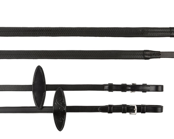 Gummizügel von PS of Sweden – Perfekter Halt und Komfort vereint Gummizügel von PS of Sweden bieten dir den perfekten Mix aus Sicherheit und Komfort. Gefertigt aus hochwertigem, pflanzlich gegerbtem englischen Leder, garantieren diese Zügel einen festen Griff bei maximalem Reitkomfort. Erlebe die Verbindung von Eleganz und Funktionalität, die deinen Reitausflug unvergesslich macht. Elegantes Design für stilbewusste Reiter Die Gummizügel bestechen durch ihr klassisches Design in edlem Schwarz oder Braun, das zu jedem Reitoutfit passt. Die feine Verarbeitung des englischen Leders verleiht den Zügeln nicht nur eine ansprechende Optik, sondern auch eine strapazierfähige Oberfläche. Das Cradles™-System fügt eine subtile Raffinesse hinzu und sorgt für einen sanften Übergang vom Zügel zum Pferdemaul. Innovative Technik für optimale Kontrolle Das patentierte Cradles™-System aus Polyester sorgt für einen weicheren Kontakt und reduziert den Druck auf das Maul deines Pferdes. Diese Zügel lassen sich einfach an deine individuellen Bedürfnisse anpassen, indem du das Cradles™-System bei Bedarf abnimmst. Mit einer Länge von 290 cm bieten die Zügel ausreichend Spielraum für jede Reitdisziplin. Vielseitiger Einsatz und höchste Qualität Die Gummizügel von PS of Sweden sind ideal für Dressur, Springen und Freizeitreiten geeignet. Pflegeleicht und robust, behalten sie auch bei regelmäßigem Gebrauch ihre Form und Funktion. Setze auf diese Zügel, um deine Reitperformance zu steigern und gleichzeitig deinem Pferd den maximalen Komfort zu bieten. * Hochwertiges, pflanzlich gegerbtes englisches Leder * Patentiertes Cradles™-System für sanften Kontakt * 290 cm Länge für vielseitige Einsatzmöglichkeiten * Elegante Farbvarianten in Schwarz und Braun * Abnehmbares Cradles™-System für individuelle Anpassung