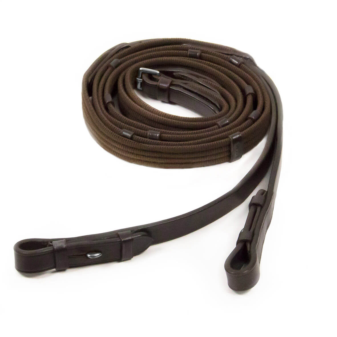 Gurtzügel mit Zaumhaken von Schockemöhle Sports – Eleganz und Funktionalität vereint Gurtzügel mit Zaumhaken von Schockemöhle Sports bietet dir die perfekte Kombination aus klassischem Design und herausragender Funktionalität. Diese Zügel verleihen deinem Reitoutfit nicht nur einen edlen Look, sondern bieten auch einen sicheren Griff und optimale Kontrolle beim Reiten. Elegantes Design für anspruchsvolle Reiter Mit ihrem dunklen Braunton und den eleganten Silber- oder Goldakzenten passen die Gurtzügel mit Zaumhaken perfekt zu jedem Zaumzeug. Der 19 mm breite Gurt aus hochwertigem Material bietet nicht nur eine ansprechende Optik, sondern auch hervorragende Griffigkeit, die dir ein sicheres Gefühl im Sattel verleiht. Technik, die überzeugt Die Gurtzügel mit Zaumhaken sind mit praktischen Martingalstoppern ausgestattet, die ein Verrutschen des Martingals verhindern und so für zusätzliche Sicherheit sorgen. Dank der robusten Zaumhaken lassen sich die Zügel schnell und einfach am Zaumzeug befestigen, was dir wertvolle Zeit spart. Vielseitige Einsatzmöglichkeiten und einfache Pflege Ob im täglichen Training oder auf dem Turnier – die Gurtzügel mit Zaumhaken sind dein verlässlicher Partner. Sie sind leicht zu reinigen und pflegen, sodass sie dir lange Freude bereiten werden. Gönn dir den Komfort und die Qualität, die du und dein Pferd verdienen. * Klassischer, breiter Gurtzügel * Stabile Zaumhaken * Integrierte Martingalstopper * 19 mm Breite für optimalen Halt