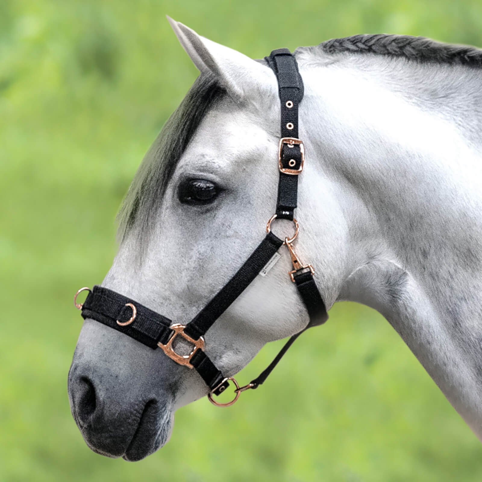 Longierhalfter Rosé von Waldhausen – Eleganz trifft auf Funktionalität Das Longierhalfter Rosé von Waldhausen vereint stilvolles Design mit herausragender Funktionalität. Mit seinen rosegoldenen Beschlägen und der hochwertigen Verarbeitung bietet es nicht nur einen optischen Blickfang, sondern auch höchsten Komfort für dein Pferd. Genieße die perfekte Balance aus Ästhetik und praktischen Vorteilen. Elegantes Design mit rosegoldenen Akzenten Das Longierhalfter zeichnet sich durch seine edlen rosegoldenen Beschläge aus, die dem klassischen schwarzen Nylongewebe eine luxuriöse Note verleihen. Dieses stilvolle Design bietet nicht nur visuelle Anziehungskraft, sondern sorgt auch für langlebige Qualität. Die weichen Polsterungen am Genickstück und Nasenriemen fügen sich harmonisch in das Gesamtbild ein und bieten ein angenehmes Tragegefühl. Herausragende Funktionalität für den täglichen Gebrauch Dank der strapazierfähigen Materialien ist das Longierhalfter Rosé ideal für den täglichen Einsatz geeignet. Die Verstellbarkeit an Genick-, Kinn- und Kehlriemen ermöglicht eine individuelle Anpassung, die optimalen Halt und Komfort garantiert. Diese technischen Eigenschaften machen es zu einem unverzichtbaren Begleiter in deinem Reitsportalltag. Vielseitiger Einsatz und einfache Pflege Das Longierhalfter Rosé eignet sich perfekt für das Longieren von Ponys, VB und WB. Durch seine pflegeleichte Handhabung bleibt es auch bei häufiger Nutzung in bestem Zustand. Überzeuge dich selbst von der hochwertigen Qualität und mache es zum festen Bestandteil deiner Ausrüstung. * Strapazierfähiges Nylongewebe * Weiche Polsterungen für hohen Tragekomfort * Verstellbar an Genick-, Kinn- und Kehlriemen * Roségoldene Beschläge als elegantes Detail