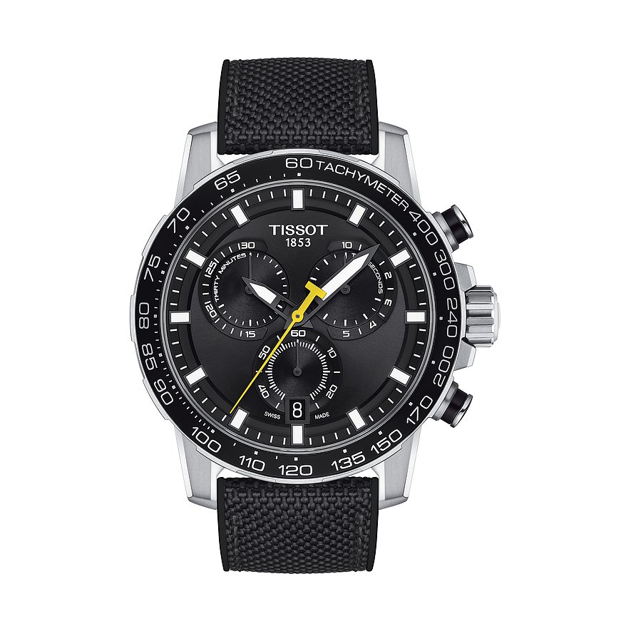 Schweizer Uhrmacherkunst mit einem herausragenden Preis-Leistungsverhältnis: Tissot sei Dank! Handwerkskunst und Qualität, verbunden mit Hingabe für Leistung und Präzision, sind der tägliche Ansporn in der Manufaktur aus dem schweizerischen Le Locle. Schon seit 1853 entstehen hier durch zukunftsweisende Technologien hochwertige Uhren in vollkommenen Designs. Die Tissot T-Sport Supersport Chrono ist die optimale Uhr für Herren, die bei Stil und Qualität keine Kompromisse machen wollen. Das Gehäuse aus Edelstahl mit Aluminium und das Textilband ergänzen sich zu einem sportiven Chronographen mit kraftvollem Charakter. Mit einem Gehäusedurchmesser von 45,5 mm und einer Gehäusedicke von 11,92 mm gehört diese Tissot zu den auffälligeren, massiveren Uhren, passt aber dennoch zu einer Vielzahl von Handgelenken. Der kühle Schimmer des Edelstahlgehäuses verleiht der Uhr einen hochwertigen Look, dazu ergänzt sich harmonisch die Lünette in Schwarz. Auf dem Ziffernblatt in Schwarz sorgen Markierungen für gute Ablesbarkeit, die Zeiger heben sich klar davon ab – für einfache Zeiterfassung auf einen Blick. Der Chronograph besitzt eine Datumsanzeige auf dem Ziffernblatt. Ein extrem hartes und kratzfestes Saphirglas sorgt für ungehinderte Sicht. Mit einer Wasserdichte von 10 bar ist Schwimmen mit der T-Sport Supersport Chrono ohne weiteres möglich. Durch das hochwertige, wartungsarme Quarzwerk in dieser Uhr ist höchste Präzision garantiert. Das Band aus Textil in klassischem Schwarz hält die Uhr sicher durch die Dornschließe am Platz. In Summe also eine Tissot wie sie im Buche steht und auch in etlichen Jahren noch für Begeisterung sorgt.
