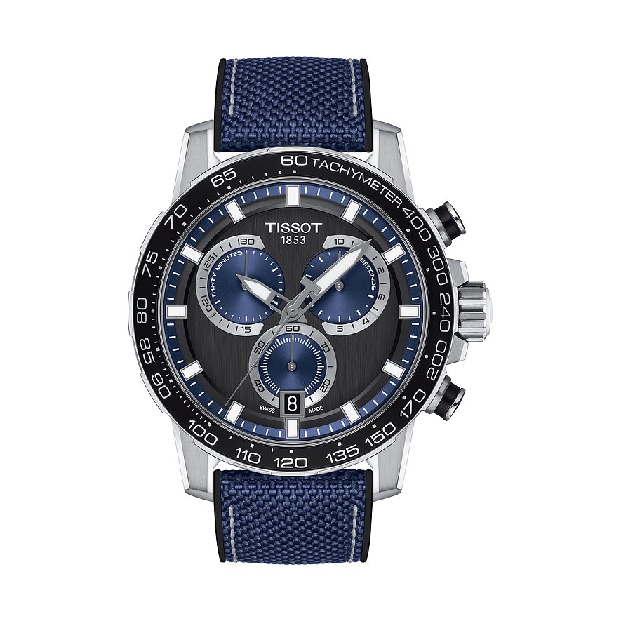 Schweizer Uhrmacherkunst mit einem ausgezeichneten Preis-Leistungsverhältnis: Tissot sei Dank! Handwerkskunst und Qualität, verbunden mit Hingabe für Leistung und Präzision, sind der tägliche Ansporn in der Manufaktur aus dem schweizerischen Le Locle. Schon seit 1853 entstehen hier durch innovative Technologien hochwertige Uhren in vollkommenen Designs. Die Tissot T-Sport Supersport Chrono ist die perfekte Uhr für Herren, die bei Stil und Qualität wissen, was sie wollen. Das Gehäuse aus Edelstahl mit Aluminium und das Textilband ergänzen sich zu einem sportiven Chronographen mit kraftvollem Charakter. Mit einem Gehäusedurchmesser von 45,5 mm und einer Gehäusedicke von 11,92 mm gehört diese Tissot zu den auffälligeren, massiveren Uhren, passt aber dennoch zu einer Vielzahl von Handgelenken. Der kühle Schimmer des Edelstahlgehäuses verleiht der Uhr einen hochwertigen Look, dazu ergänzt sich harmonisch die Lünette in Schwarz. Auf dem Ziffernblatt in Schwarz sorgen Markierungen für gute Ablesbarkeit, die Zeiger heben sich deutlich davon ab. Der Chronograph besitzt eine Datumsanzeige auf dem Ziffernblatt. Ein extrem hartes und kratzfestes Saphirglas sorgt für ungehinderte Sicht. Durch die Wasserdichte von 10 bar erlaubt die T-Sport Supersport Chrono auch Schwimmen und Baden ohne Reue. Das hochwertige, wartungsarme Eta-Quarzwerk garantiert jederzeit höchste Präzision. Ein farblicher Hingucker ist das Band aus Textil in Blau mit Dornschließe, durch das die Uhr sicher und bequem am Arm gehalten wird. Alles in allem eine Tissot, die nichts zu wünschen übrig lässt und auf lange Jahre hinaus zum geliebten Begleiter werden wird.