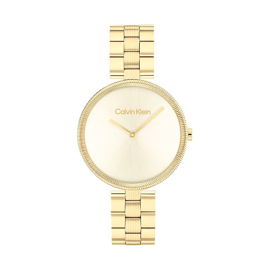 Calvin Klein steht für minimalistisches Design und zeitlose Eleganz. Mit klaren Linien und schlichten Formen sind die Zeitmesser perfekt für alle, die einen dezenten, aber dennoch stilvollen Look lieben. Diese sportlich-elegante Uhr am gleichermaßen schicken wie robusten Edelstahl-Band ist die perfekte Wahl für jede Frau, die auf der Suche nach einem zeitlosen Klassiker ist. Das champagnerfarbene Ziffernblatt der Calvin Klein Gleam setzt optisch einen besonderen Akzent, während das Gehäuse, das Armband und die Lünette einheitlich in Gold gehalten sind. Ein bewährter Klassiker ist das runde Gehäuse. Ein Quarzwerk der Marke Time Modul sorgt für die nötige Präzision. Ein Mineralglas bietet eine klare Sicht auf das Ziffernblatt und guten Schutz gegen alle Einflüsse, die bei normalem Gebrauch entstehen. Dieser Zeitmesser ist bis zu 3 Bar wasserdicht, du kannst ihn also sorglos beim Händewaschen tragen. Mit der Faltschließe lässt sich das Armband leicht anlegen und sicher verschließen. Wir finden: Mit ihrer modernen Eleganz und präzisen Handwerkskunst ist die Calvin Klein Gleam Damenuhr ein stilvoller Begleiter für deinen Alltag. Am Besten du probierst sie sofort aus!