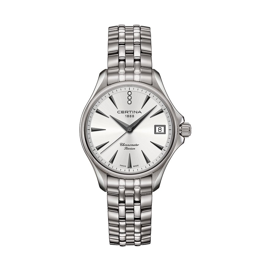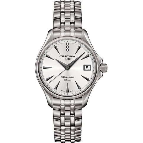 Sportlichkeit ist bei Certina eine Frage der Qualität und der DNA. Neben einem großen Traditionsbewusstsein wird die Sportuhrenmarke auch von einer gehörigen Portion Neugierde auf die Uhrmacherkunst der Zukunft angetrieben, die sie heute schon aktiv mitgestaltet. Mit technischen Innovationen, herausragenden Uhrwerken und vielfältigen Funktionen sorgt Certina immer wieder für Aufsehen. Die DS Action Lady ist die perfekte Wahl für alle, die faszinierende Materialien schätzen. Diese hochwertige Damenuhr mit einem Gehäuse aus Titanen verleiht dem Handgelenk lässigen Luxus. Durch sein stilvolles Design harmoniert der Zeitmesser mühelos mit jedem Outfit. Das silberne Armband aus Titan sieht nicht nur hervorragend aus, sondern sorgt auch für besonders leichten Tragekomfort, ist besonders stoß- und kratzfest sowie antiallergen und korrosionsbeständig. Durch den Gehäusedurchmesser von 33,8 mm ist die DS Action Lady vor allem für zarte Handgelenke die richtige Wahl. Das silberne Zifferblatt mit Markierungen fügt sich harmonisch in das Gesamtdesign ein. Eine glamouröse Note bringen funkelnde Diamanten ins Spiel. Nicht nur elegant, sondern auch praktisch: Neben der Uhrzeit lässt sich auch das Datum mit einem Blick ablesen. Ein gleichermaßen hochklassiges wie robustes Saphirglas schützt das Zifferblatt vor Kratzern, Stößen und Schlägen. Das Eta-Quarzwerk ist die Basis für die zuverlässige Präzision dieser Uhr. Egal ob im Alltag oder bei spannenden Abenteuern – mit einer Wasserdichte von 20bar ist die DS Action Lady immer die richtige Wahl. Schwimmen und Tauchen sind zum Beispiel absolut kein Problem für diese Uhr. Die Butterfly-Faltschließe hält nicht nur sicher, sondern ist auch gut in der Größe verstellbar. Durch das leicht austauschbare Armband lässt sich der Look der Uhr ganz einfach anpassen und so immer wieder ein neues modisches Statement setzen.