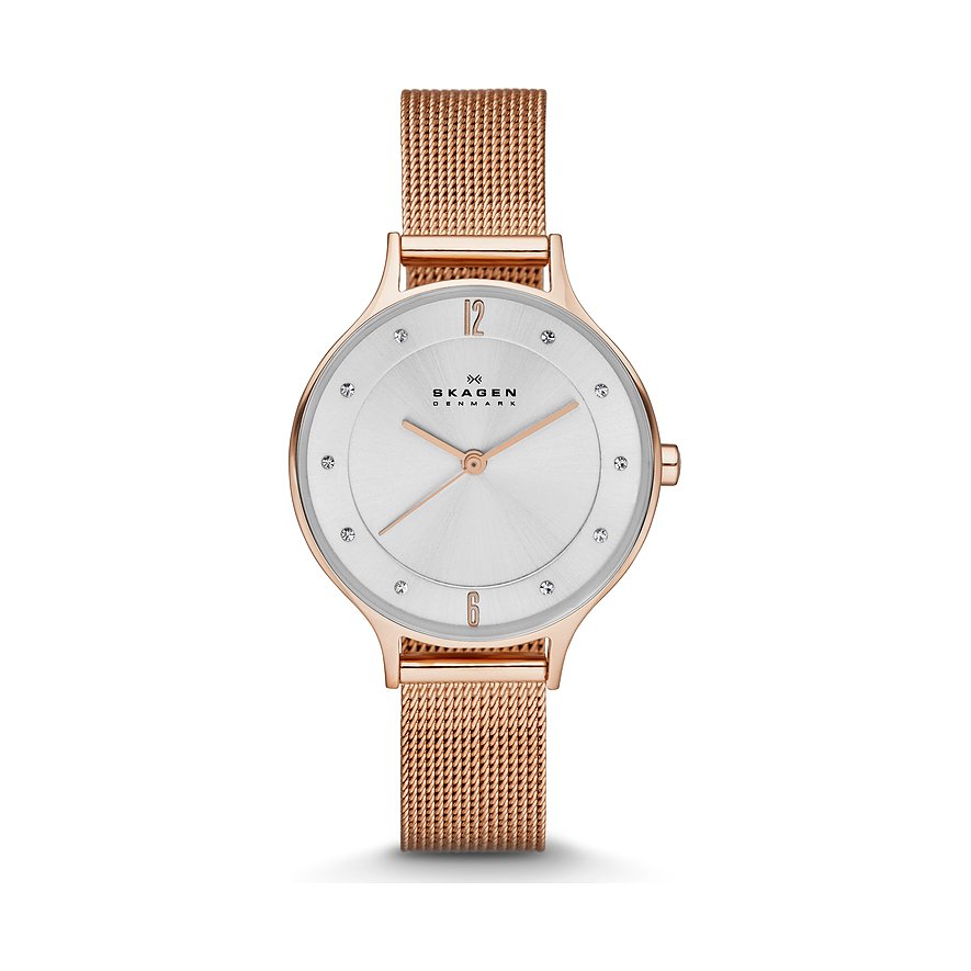 Die schlichte, zeitlose Eleganz, die Skagen-Uhren verkörpern, reflektiert die Gelassenheit des Lebens an der Küste. Das ist dänischer Minimalismus in Perfektion! Dabei legt die renommierte Lifestyle-Marke besonderen Wert auf maximale Vielseitigkeit und Tragbarkeit, ohne ikonische Merkmale, Nachhaltigkeit und soziales Engagement aus den Augen zu verlieren. Die Pro-Planet-Kriterien der Fossil Group dienen Skagen als Leitfaden, um umweltfreundlichere Materialien zu integrieren und somit einen Beitrag zur Bewahrung unserer Umwelt zu leisten. Ein sportlich-eleganter Klassiker ist diese Damenuhr mit Edelstahl-Gehäuse an einem unkomplizierten Edelstahl-Band. Gehäuse und Armband der Skagen SKW2151 sind in Roségold gehalten. Das silberne Ziffernblatt ist eine harmonische Ergänzung. Für eine Extra-Dosis Glamour sorgen 10 glitzernde Glassteine. Das integrierte Quarzwerk garantiert zuverlässige Präzision. Durch die Markierungen fällt die Orientierung auf dem Ziffernblatt leicht, so dass die Zeit gut ablesbar ist. Ein Mineralglas bietet eine klare Sicht auf das Ziffernblatt und guten Schutz gegen alle Einflüsse, die bei normalem Gebrauch entstehen. Dieser Zeitmesser ist bis zu einer Tiefe von 30 Metern wasserdicht (3 Bar), was bedeutet, dass er mühelos Spritzwasser – wie es beim Händewaschen, im Regen oder anderem leichten Wasserkontakt entsteht – standhält. Die Klappschließe erleichtert das Anlegen des Armbands und garantiert sowohl einen sicheren Halt als auch einen guten Sitz am Arm. Eins steht fest: Wer seinem Look eine individuelle Note verleihen möchte, macht mit der stilvollen Skagen SKW2151 Damenuhr alles richtig. Worauf wartest du also noch?