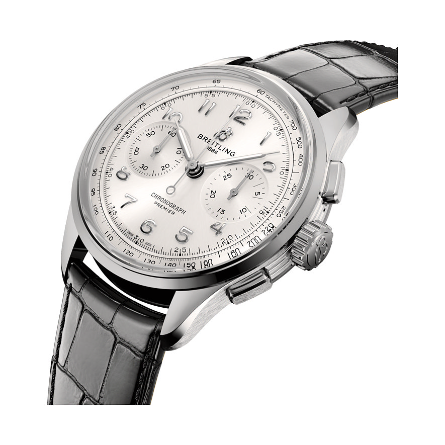 1884 gegründet, hat Breitling durch bahnbrechende Innovationen wiederholt gezeigt, dass die Luxusmarke nicht nur für zeitlos schöne Designs mit starken Anklängen an die Luftfahrt steht, sondern auch Technologieführer der Branche ist. Die Breitling Premier, ein klassischer Chronograph für den anspruchsvollen Herrn, bietet mit ihrem Edelstahlgehäuse und Alligatorband dynamischen Style. Bei einem Gehäusedurchmesser von 40 mm und einer Gehäusehöhe von 13,3 mm ist diese Uhr zwar auffälliger, dicker, aber dennoch passt sie an eine Vielzahl von Handgelenken. Der kühle Schimmer des Edelstahlgehäuses verleiht der Uhr einen hochwertigen Look, dazu ergänzt sich harmonisch die Lünette in Silber. Auf dem Ziffernblatt in Weiß sorgen Markierungen für gute Ablesbarkeit, die Zeiger heben sich deutlich davon ab. Typisch für einen Chronographen zeigt auch diese Breitling die Komplikationen Totalisatoren und kleine Sekunden. Das verwendete Saphirglas ist durch seine Härte besonders widerstandsfähig gegen Kratzer und damit auch sehr langlebig. Durch die Wasserdichte von 10 bar erlaubt die Premier auch Schwimmen und Baden ohne Reue. Das Automatikwerk zieht sich bequem selbst bei jeder Handgelenksbewegung auf. Ein schönes Feature für Liebhaber: Das Sichtfenster im Boden gewährt Einblicke ins Werk. Die Bewegungen des Rotors und der Unruh lassen sich so beobachten. Mit einer Gangreserve von beeindruckenden 70 Stunden kann die Uhr mehrere Tage lang ungetragen bleiben, ohne neu gestellt werden zu müssen. Das Band aus Alligator in klassischem Schwarz hält die Uhr sicher durch die Sicherheits-Faltschließe am Platz. Als ein gelungenes Gesamtpaket aus Design und Technik wird diese Breitling auch in etlichen Jahren noch ihren Platz als geliebter Begleiter am Handgelenk haben.