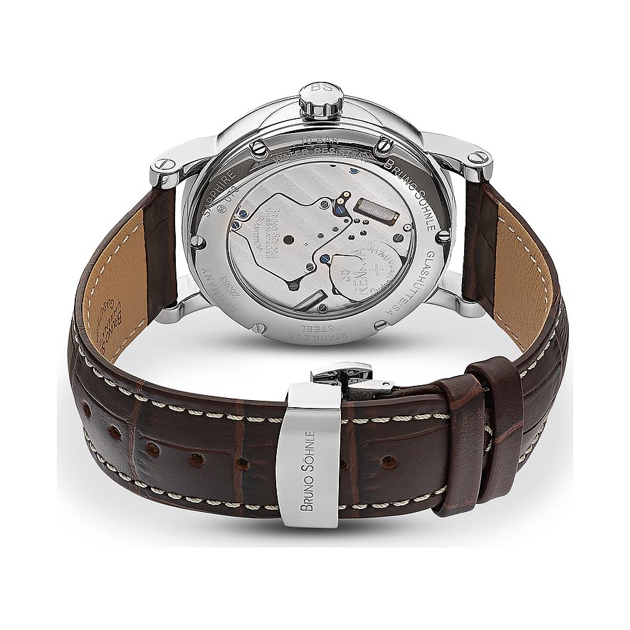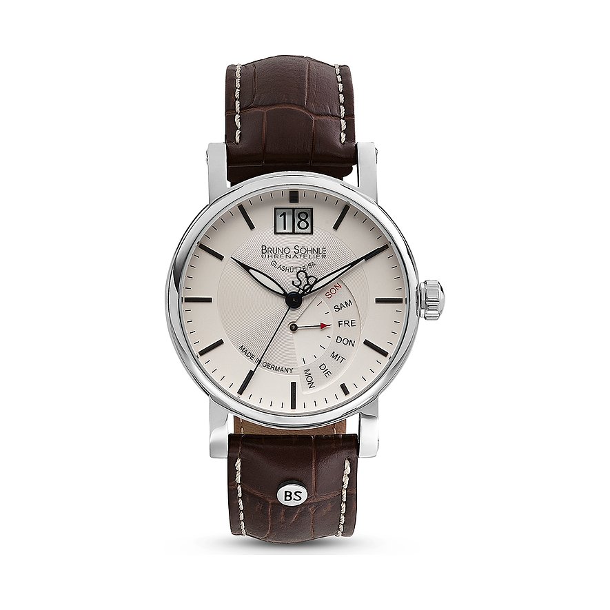 Bruno Söhnle ist weltbekannt für seine hochwertigen und präzisen Uhren. Die deutsche Manufaktur aus Glashütte kombiniert moderne Technologie mit klassischer Uhrmacherkunst. Ein echter Eyecatcher ist die Pesaro I. Die luxuriöse Herrenuhr übt mit ihrem eleganten Design in bester Qualität eine unwiderstehliche Anziehungskraft aus und fügt sich harmonisch in jedes Outfit ein. Das braune Armband aus Leder schmiegt sich angenehm um das Handgelenk und perfektioniert den zeitlosen Look der Uhr. Die Pesaro I hat einen Gehäusedurchmesser von 43 mm und sieht deshalb sowohl an schmaleren als auch an breiteren Handgelenken gut aus. Gekonnt fügt sich das beigefarbene und cremefarbene Zifferblatt mit Markierungen in das gelungene Gesamtbild ein. Das Ablesen der Zeit ist selbst bei ungenügenden Lichtverhältnissen ein Kinderspiel – der Leuchtzeiger sei Dank! Mit diesem Zeitmesser behält man nicht nur die Zeit zuverlässig im Blick, sondern auch Datum und Wochentag. Ein gleichermaßen hochwertiges wie robustes Saphirglas schützt das Zifferblatt vor Kratzern, Stößen und Schlägen. Der Zeitmesser verfügt über ein hochwertiges Ronda-Quarzwerk im Inneren. Durch das Sichtfenster im Gehäuseboden erhält man spannende Einblicke in die Arbeit des Uhrwerks. Mit einer Wasserdichtigkeit bis 10 bar ist die Uhr der ideale Begleiter für Alltag und Abenteuer: Sogar Schwimmen ist unbesorgt möglich! Die Butterfly-Faltschließe verspricht nicht nur sicheren Halt, sondern auch gute Verstellbarkeit. Für mehr Variabilität ist das Armband leicht austauschbar – so lässt sich der Look der Uhr noch besser an verschiedene Outfits anpassen.